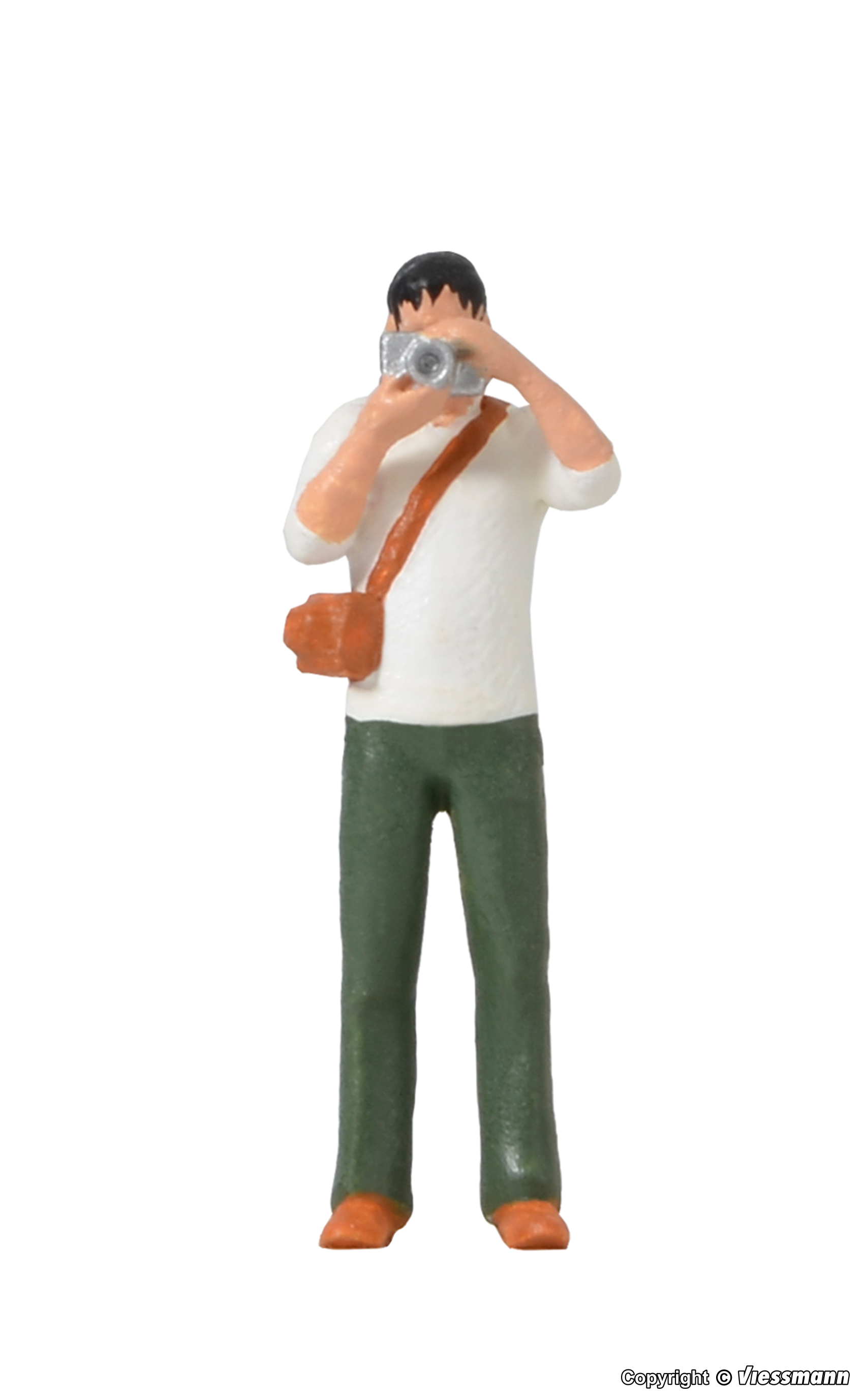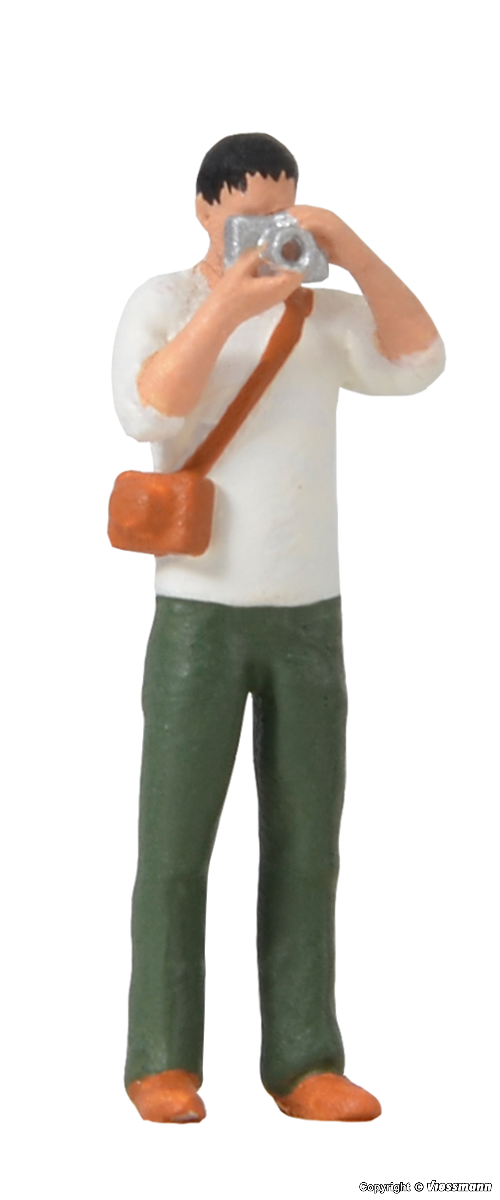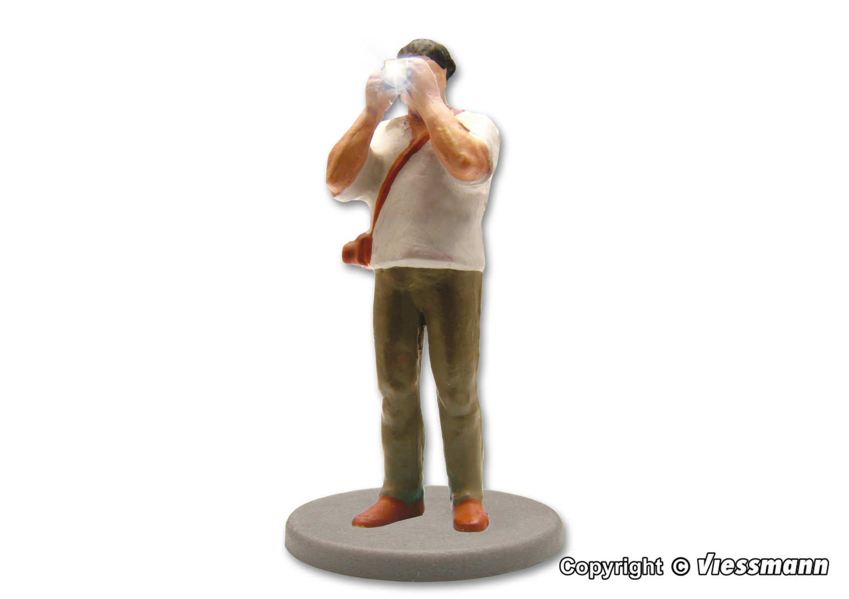 Dokumentiert das Leben auf der Modellbahn: Fotograf mit Apparat und funktionsfähigem Blitz. In unregelmäßigen Abständen blitzt durch eine Mikro-LED simuliertes Blitzlicht aus dem Fotoapparat. Einbautiefe: 39 mm.