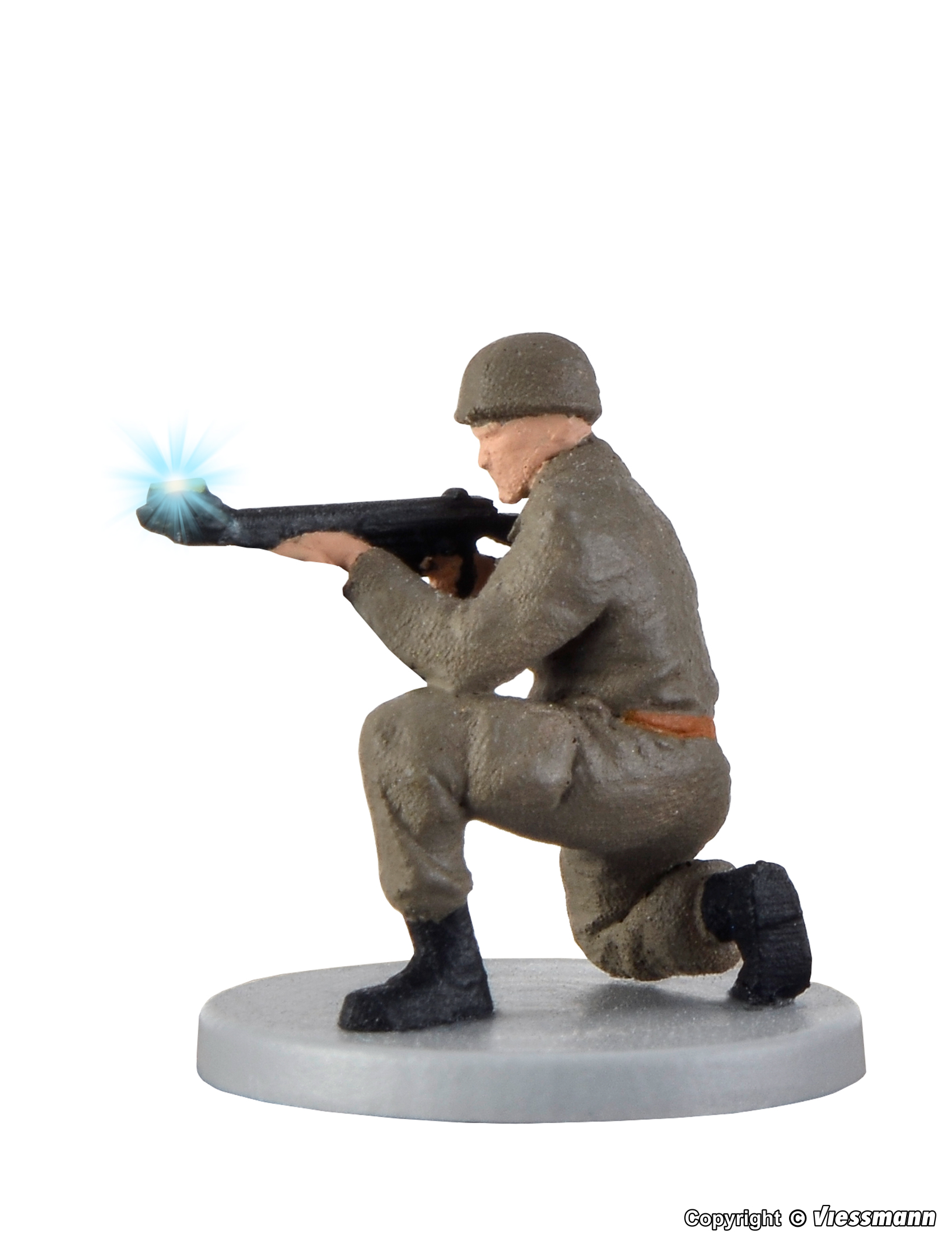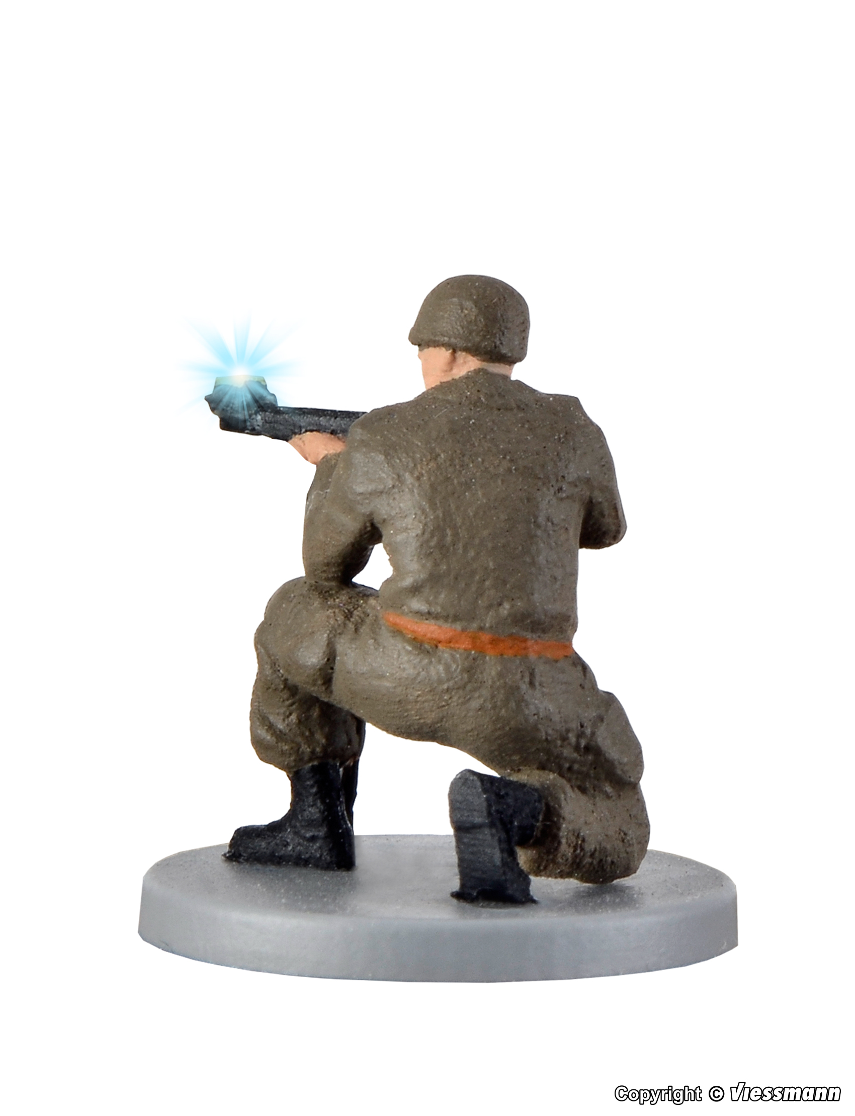 In unregelmäßigen Abständen blitzt durch eine Mikro-LED simuliertes Mündungsfeuer aus dem Lauf. Einbautiefe: 39 mm. Höhe: 1,5 cm. Passend dazu unser kibri Bundeswehrsortiment, passendes Soundmodul: Art. 5579.