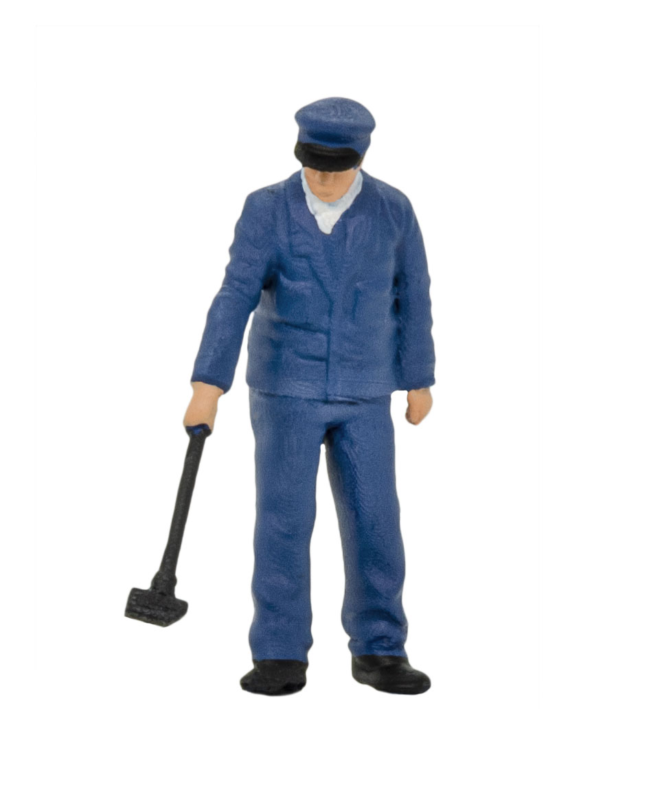 H0 Wagenmeister, bewegt - Vor jeder Zugfahrt stellt der Wagenmeister eigenständig die Betriebssicherheit und Verkehrstauglichkeit an Zügen und Waggons, sowie deren Ladungen fest. Er dreht sich und schlägt dabei mit seinem Hammer gegen das Rad, um anhand der Klangprobe einen Bruch des Radreifens festzustellen. Einbautiefe: 39 mm