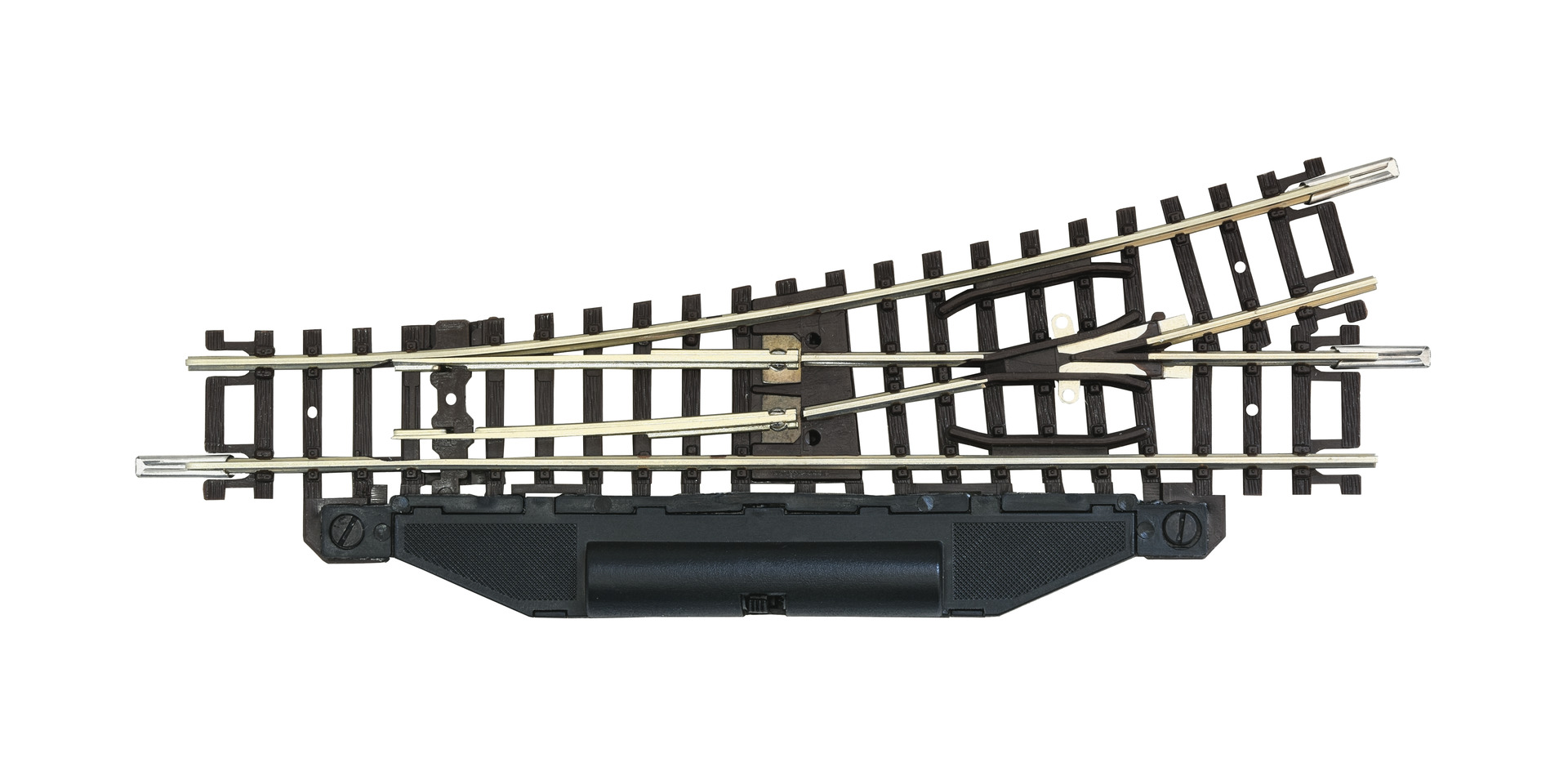 Weiche links 15° Handbetrieb. Länge des geraden Gleises 112,6 mm, Radius des Zweiggleises 362,6 mm (entspricht R5).