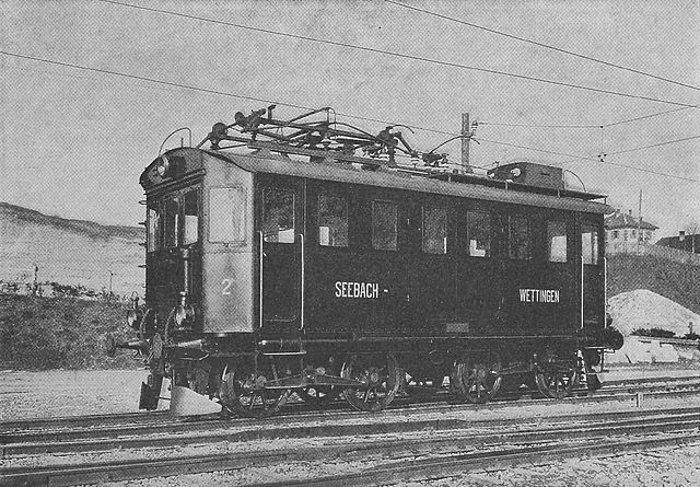 1901 entschloss sich die Konstruktionswerkstätte "Oerlikon" zu den ersten ernsthaften Versuchen mit Elektrizität im schweizerischen Schienenverkehr. Zu diesem Zwecke schlugen die "Oerlikon-Werke" der SBB/CFF vor, eine Versuchstrecke von Seebach nach Wettingen (19 km) auf der bereits bestehenden Strecke zu errichten, dies sogar auf eigene Rechnung der Oerlikon-Werke. Es entstand somit die erste elektrifizierte Eisenbahnlinie (Monophasen Stromversorgung 750 Volt) auf schweizerischem Boden.