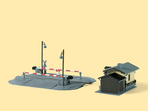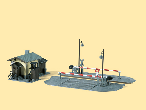 Beschrankter Bahnübergang, gerade und manuell bedienbar. An der Strecke Flöha-Reitzenhain. Schrankenwärterhaus mit angebautem Geräteschuppen und Vorhäuschen, Handkurbelbock für Schrankenfernbedienung, Läutewerk und 2 typischen Mastlampen. Fahrrad, Müllkübel und Sprossenleiter liegen bei.