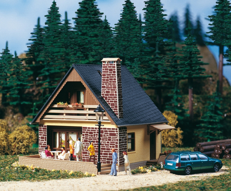 Interessantes Einfamilienhaus mit Kaminschornstein, Dachgaube, holzverkleideten Giebeln, Loggia und Laterne für die Terrasse sowie Blumendekomaterial. Schornstein und Terrassenwand sind natursteinverblendet. Zur überdachten Haustür führt eine Treppe.