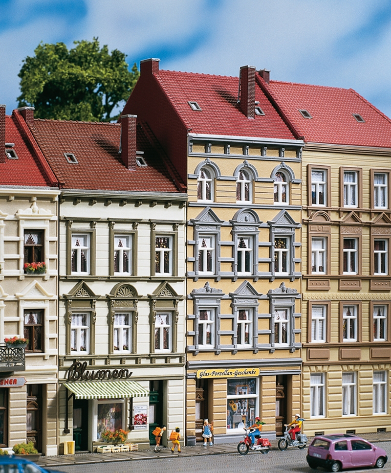 Ein drei- und viergeschossiges Gebäude mit Gewerberäumen im Erdgeschoss. Der Sonnenschutz für das Blumengeschäft liegt bei.