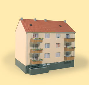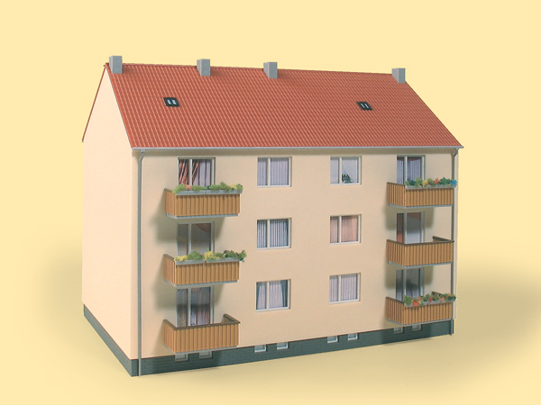 Wohnraum war Ende der 1950er Jahre immer noch ein Mangel. Sowohl in der Stadt als auch auf dem Land baute man deshalb diese oder ähnliche Mehrfamilienhäuser. Später wurden sie saniert und modernisiert. Dem Bausatz liegen alle Teile zum Variieren bei. Der Fantasie, eine Neubausiedlung zu gestalten, sind damit keine Grenzen gesetzt.