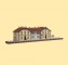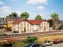 Ein Kleinstadtbahnhof mit interessantem Zubehör, wie Bahnsteig, Treppen für die Straßenseite, Uhr, Lampen, Außenwaschbecken, Informationstafel für Ankunft und Abfahrt sowie Fahrradständer.
