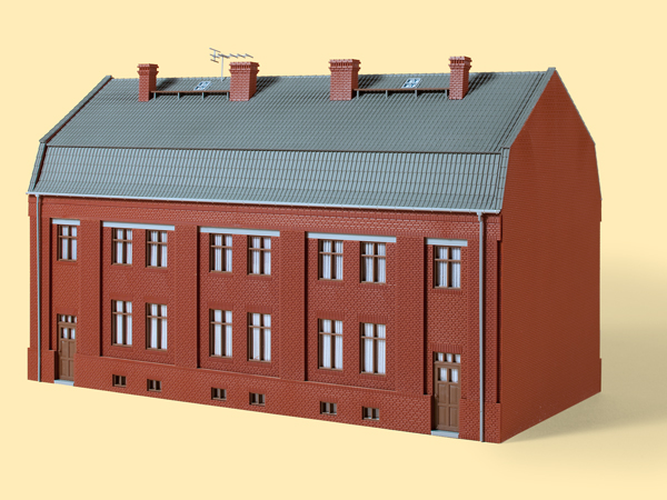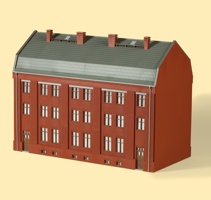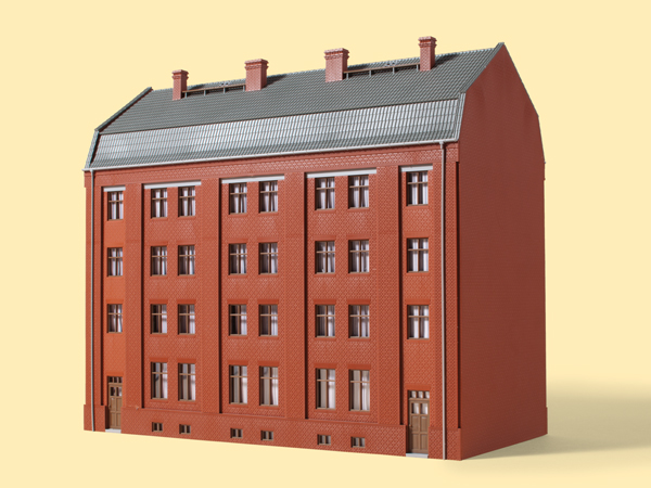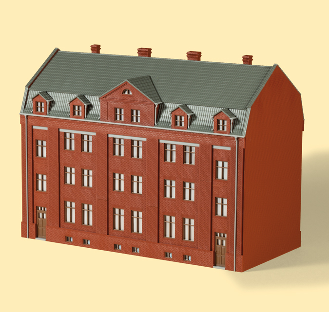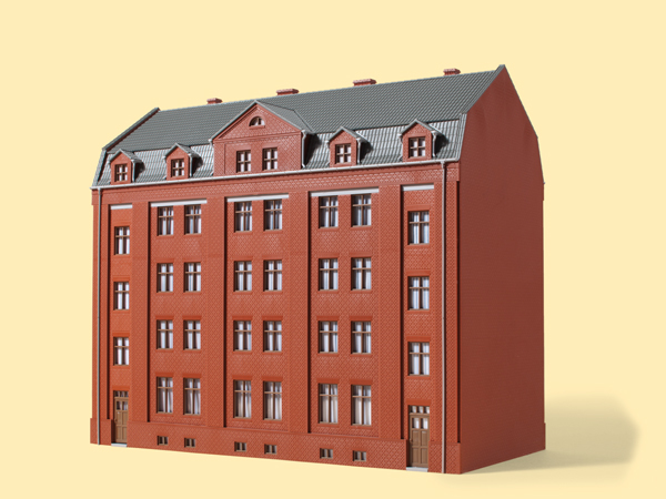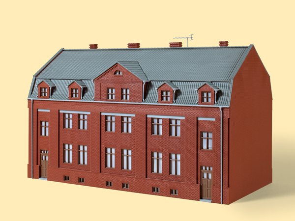 Die Gestaltung in mehreren Varianten ist möglich. Einerseits kann man das 4-geschossige Grundmodell durch Sollbruchlinien zu einem 3- oder 2- geschossigen Gebäude umbauen und andererseits das Dach wahlweise mit oder ohne Dachgauben gestalten. Die Vorlage für dieses Modell lieferte ein Gebäude in Görlitz.