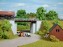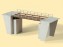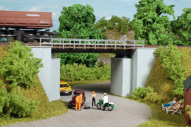 Als Eisenbahnbrücke für eingleisige Strecken geeignet und durch Sollbruchlinien in der Höhe zu kürzen. Die Pfeiler sind aus Beton, die Holzstruktur von der Bretterschalung sichtbar.