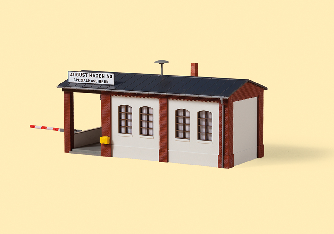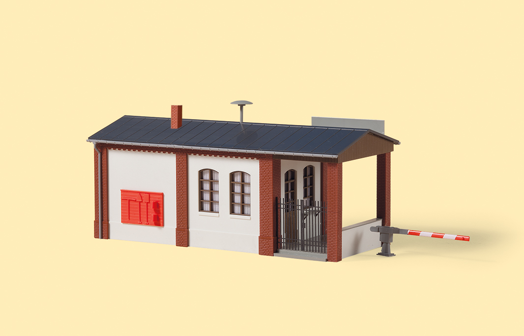 Mit Werksuhr, Halbschranke, Feuerwehrgerätetafel, Sirene und Briefkasten.