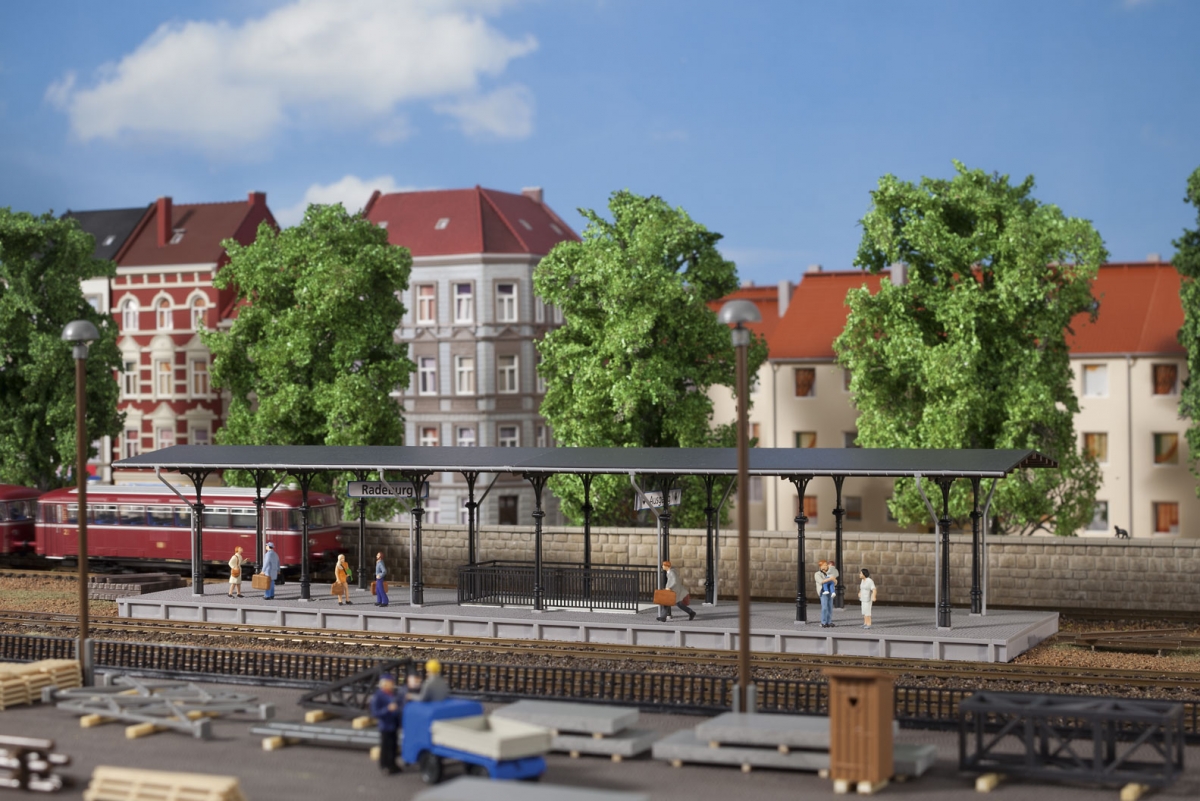 Bahnsteig mit gusseisernen Säulen. Die Treppe zur Unterführung muss nicht zwingend eingebaut werden. Das Geländer ist aus stabilem Karton in Lasercut-Technologie gefertigt. Zur Verlängerung können Sie mehrere Bahnsteige aneinanderreihen bzw. den Art. 41 634 ohne Überdachung nutzen. Die Bahnsteighöhe ist variabel. Bei Gleisen mit Bettung, Höhe durch Unterbau ausgleichen.