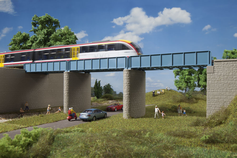 Mit diesem Bausatz erreichen Sie bei unserem Art. 11 441 Blechträgerbrücke noch mehr Variantenvielfalt. Eingleisig, gerade und mit unten liegender Fahrbahn sowie außen liegenden Hauptägern.