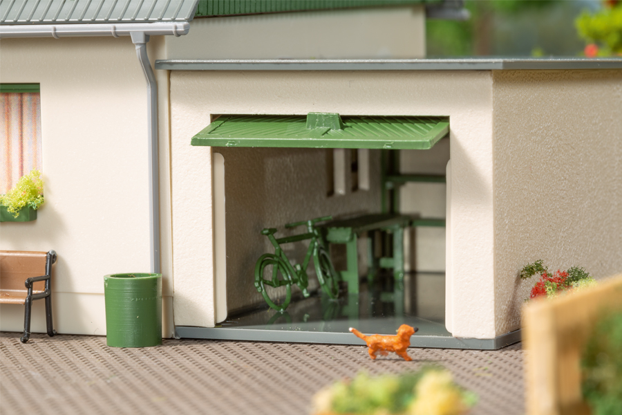 Zur Gestaltung einer realitätsnahen Szene liegen Wasserfass und Pergola, Außenleuchten, Schneefangrundhölzer, Solarkollektoren, Dachentlüfter, Sat.-Anlage sowie Blumenkästen und Pflanzkübel mit bunten Schaumflocken bei.