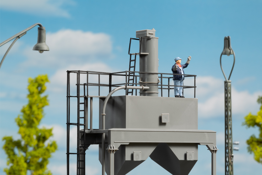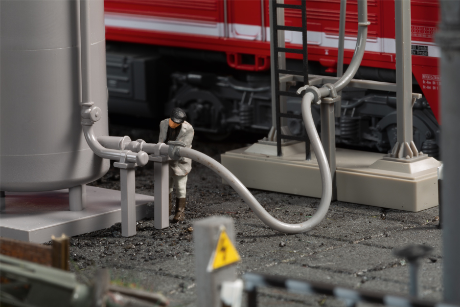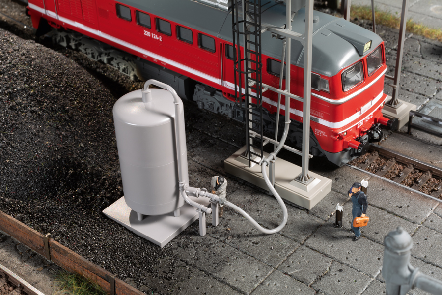 Zu den Betriebsstoffen jeder Lokomotive gehört auch Sand. Zur Erhöhung der Reibung beim Anfahren und Bremsen, besonders bei schwierigen Witterungsverhältnissen, wird dieser aus den Sandbehältern der Lok über Rohrleitungen zwischen Rad und Schiene gestreut. Dieser Sand wird in den Betriebswerken ebenso wie Kohle und Wasser oder Diesel nachgefüllt. Das Auhagen-Modell hat eine Einheitsbauart zum Vorbild welche z.B. im Bw Berlin-Schöneweide und Lutherstadt Wittenberg im Einsatz war und ist. Das Modell ist sehr filigran gestaltet. Die Position des Vorratsbehälters neben dem Turm kann frei gewählt werden. Die Verbindung erfolgt durch einen flexiblen Schlauch. Für die Verwendung mit Bettungsgleis liegen Erhöhungen bei. Originalmodell