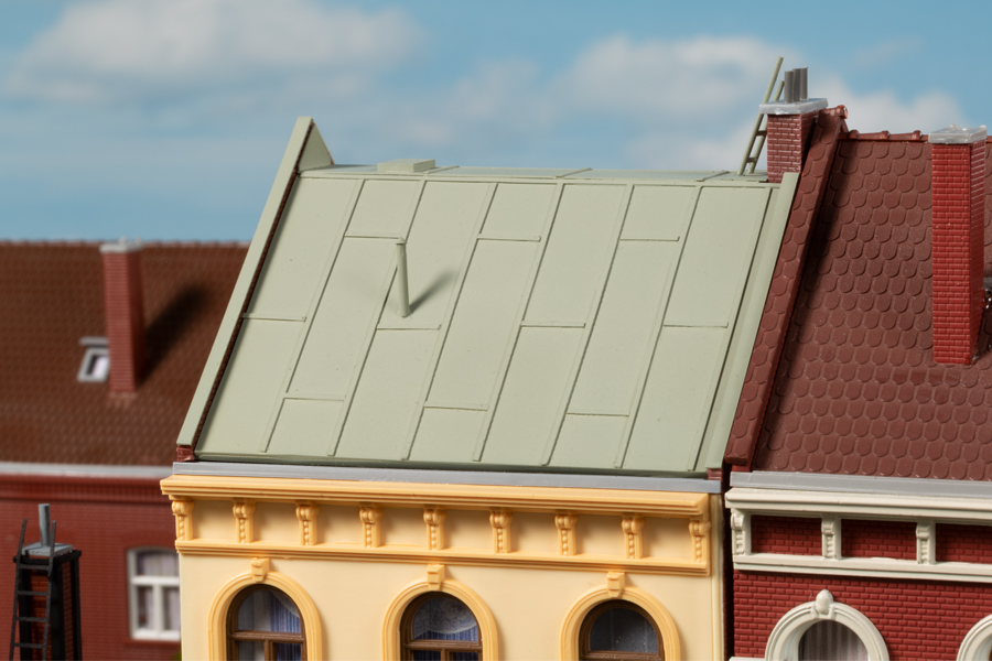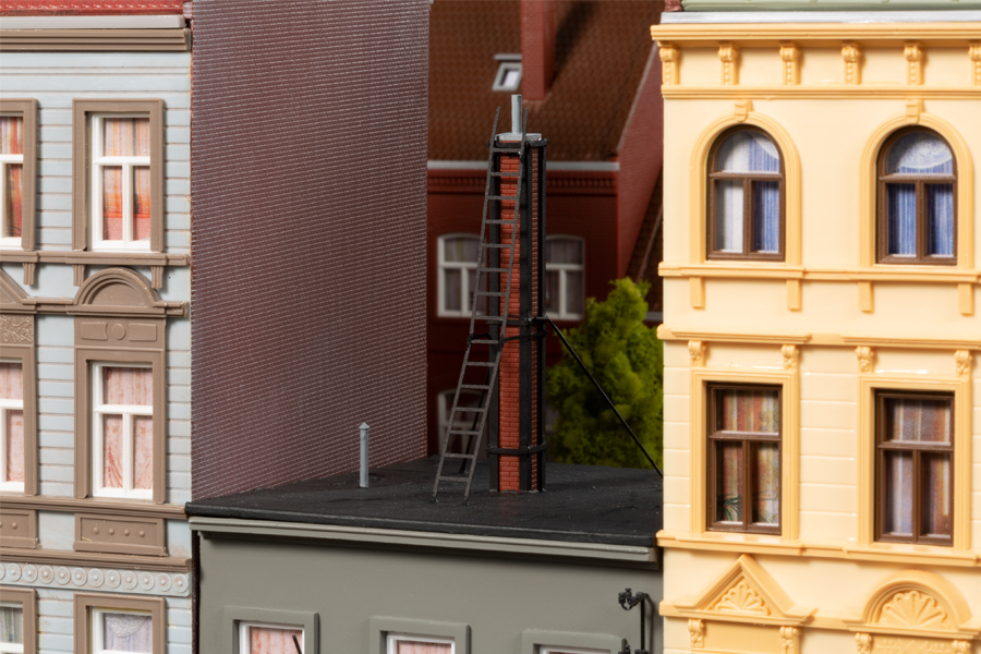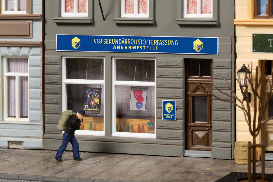Mit diesen beiden neuen Stadthäusern wird die Schmidtstraße noch länger und zur Flaniermeile, die zum Schaufensterbummel einlädt. Das in einem der beiden Gebäude ein Whisky-Laden ist, kommt nicht von ungefähr. Auch hier waren Seminarteilnehmer, die im Zweithobby Whiskykenner sind, die Ideengeber. Passend zu den geistigen Getränken werden auch Tabakwaren angeboten. Das Dach ist mit Blechplatten gedeckt. Das Nachbarhaus ist noch von Kriegszeiten gezeichnet. Die beiden oberen Etagen fehlen und das Flachdach ist provisorisch. Interessant ist der lange Schornstein, von Metallrahmen und Stützen gehalten. Im Erdgeschoss werden Sekundärrohstoffe angenommen.