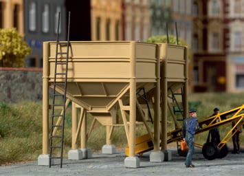 Für Wartungsarbeiten gibt es eine Aufstiegsleiter. Sie ist, wie auch die Schiebergestänge zum Bedienen der Entladeklappen, filigran aus Karton gelasert. Vervollständigt wird das Set durch eine LKW-Waage. Die Wiegeeinrichtung steht wettergeschützt in einem Unterstand.