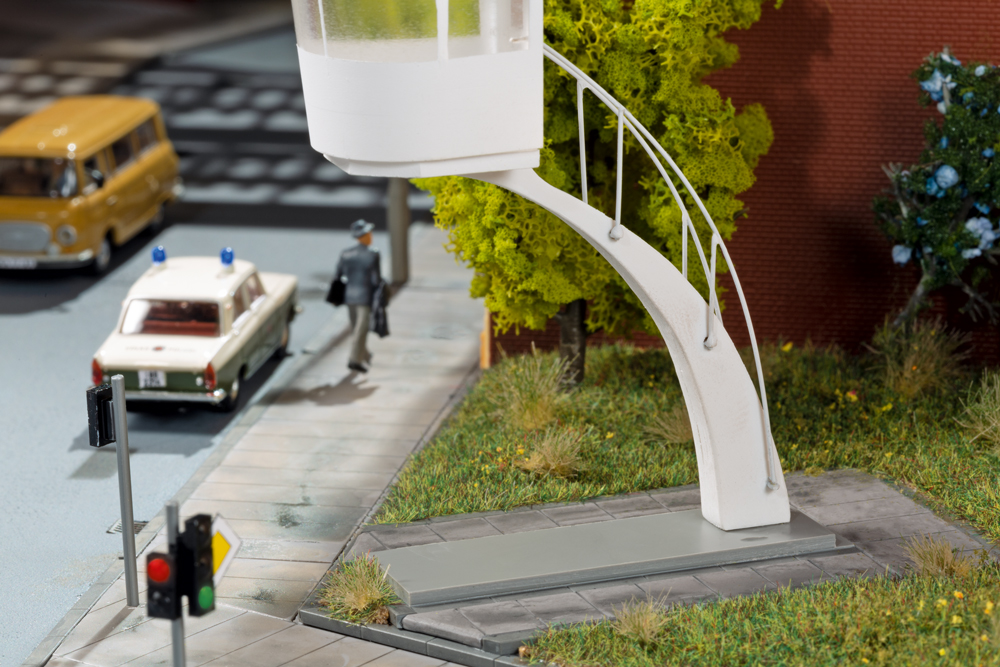 Verkehrskanzel mit Zubehör - Die stark zunehmende Massenmotorisierung in den 1960er Jahren erforderte an neuralgischen Verkehrsknotenpunkten in Großstädten eine sichere Verkehrsu?berwachung und -regelung. Zur Beobachtung und Steuerung des Verkehrs dienten solche Tu?rme. Vom Vorbild unseres Modells konnte bedarfsgerecht manuell in die Steuerung der Lichtsignalanlagen des Straßenbahn-, des Oberleitungsbus- sowie des PKW-Verkehrs eingegriffen werden. Bei einem Ausfall der Technik erfolgte die Verkehrsregelung konventionell durch einen Verkehrspolizisten auf einem Podest in Kreuzungsmitte. Beide Szenarien können mit passenden, beiliegenden unbemalten Figuren nachgestellt werden.Originalmodell
