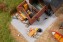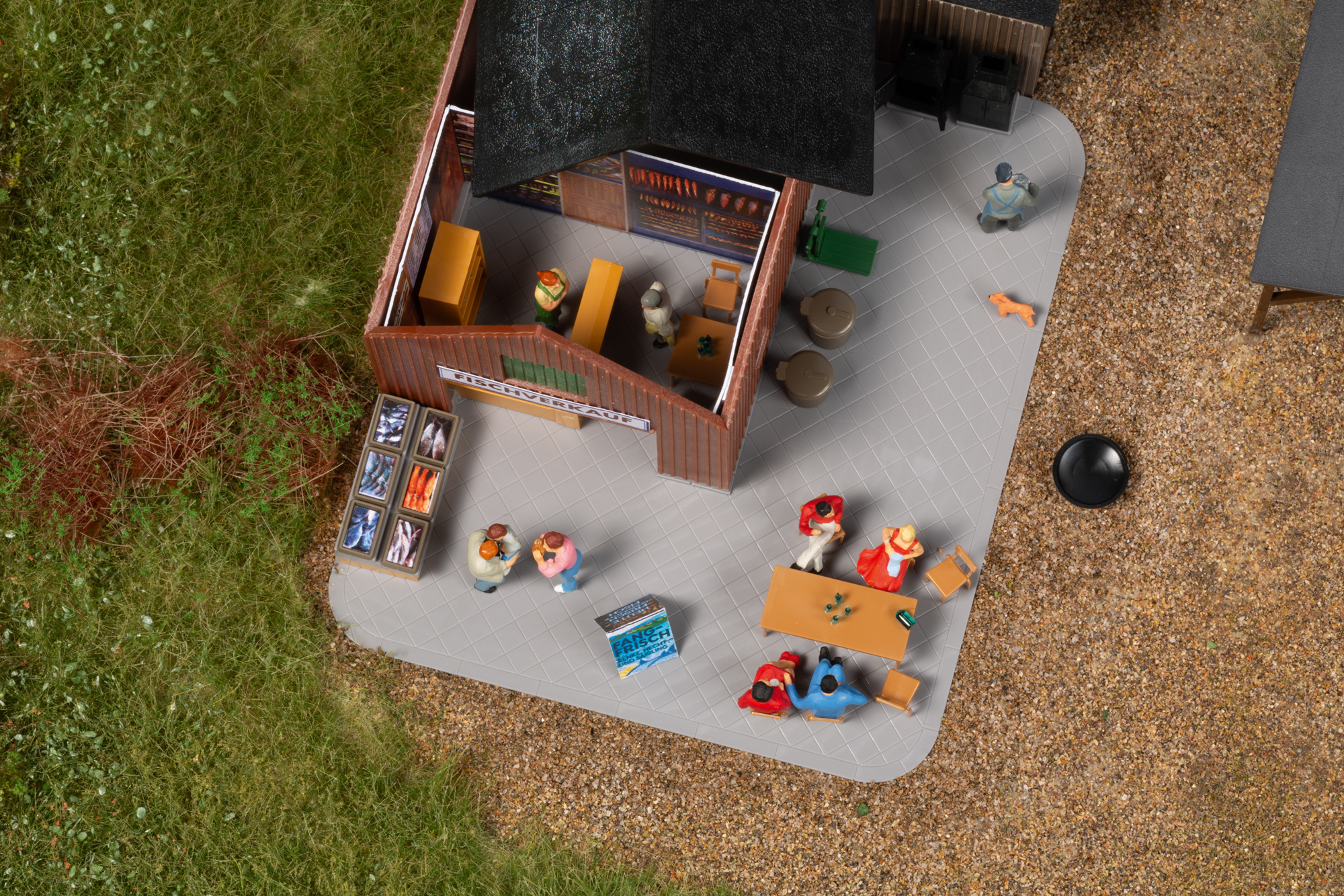 Hofladen - Ein kleineres, holzverschaltes Nebengebäude mit Anbau beherbergt passend zum Artikel 11 474 und 11 476 einen Fischverkauf. Die mit Tresen, Regalen, Auslagen und einer Waage eingerichtete Verkaufsstelle bietet dank der beiden Räucheröfen auch eine Vor-Ort-Verkostung an. Dafür stehen Sitzgelegenheiten zur Verfügung. Weitere Dekorationen, auch anderer zu verkaufender Waren, eine Feuerschale und Mülltonnen runden den Bausatz ab. Hofladen 70 x 53 x 62 mm Nebengebäude 58 x 39 x 33 mm
