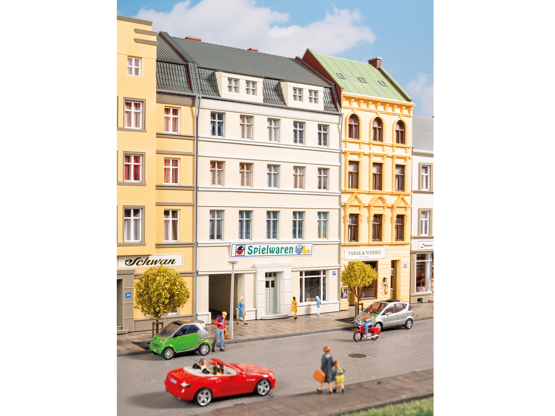 Dieses Stadthaus setzt die beliebte Stadthausserie stimmig fort. Mit der Hausnummer 28 fügt es sich harmonisch in geschlossene Straßenzüge ein. Der Bausatz lässt sich wahlweise als Spielwarenfachgeschäft oder als Tanzlokal aufbauen. Optional kann eine Durchfahrt in den Hinterhof dargestellt werden. Für stimmungsvolle Akzente ist das Modell mit Art. 58 111 LED-Beleuchtung äSpielwaren“ oder Art. 58 112 LED-Beleuchtung äLove“ erweiterbar. 123 × 110 × 210 mm