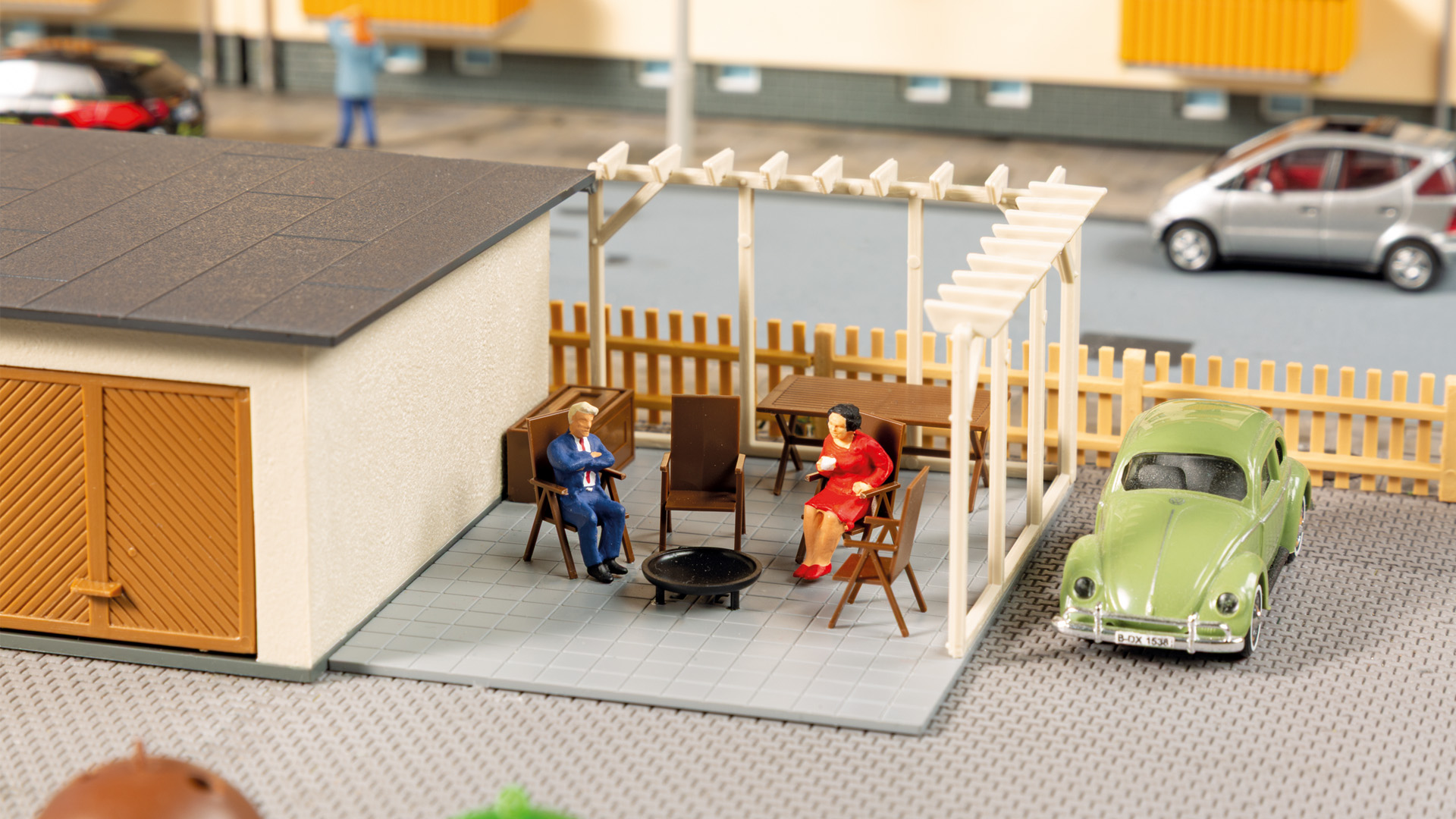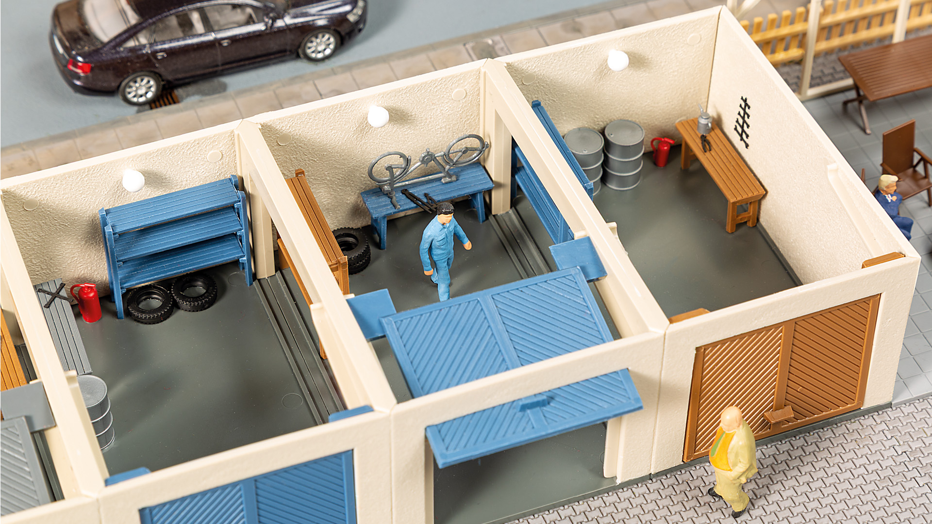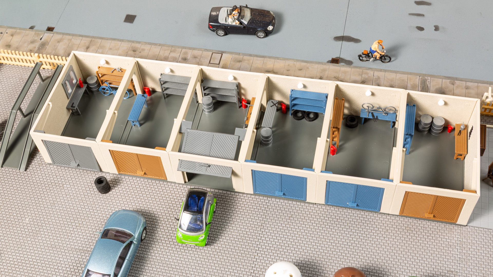 Diese Garagenzeile bringt typische Alltagsszenen in Wohngebiete und Randbereiche der Anlage. Der Bausatz umfasst sechs Garagen, die sich als Reihe oder leicht versetzt aufstellen lassen. Mehrfarbig ausgeführte Tore sorgen für Abwechslung. Für eine lebendige Umgebung liegt viel Zubehör bei, darunter Pergola, Feuerschale und Stühle für eine kleine Sitzecke. 297 × 74 × 33 mm