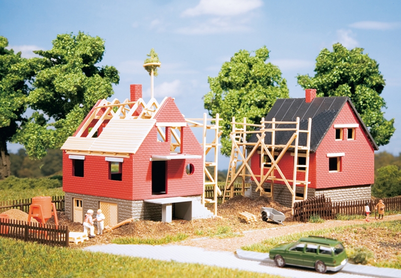 Mit Baugerüsten und Richtkrone. Der Dachstuhl steht schon, die Schalung ist aufgebracht. Kombiniert mit dem Art. 12 267 Baustellenzubehör kann der Bau zügig fortgesetzt werden.