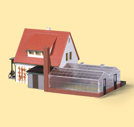 Wohngebäude mit Eingang zum Binderaum auf der Rückseite. Angebauter Geräteschuppen, 2 Treibhäuser mit Innenausstattung, kleines Heizhaus, Frühbeetkästen, Werkzeug und Schubkarre.