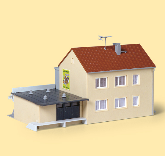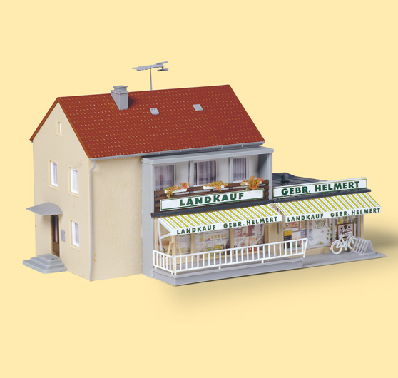 Im Erdgeschoss Handel mit ländlichem Bedarf und Lebensmitteln. Im Obergeschoss Wohnung und Büro.