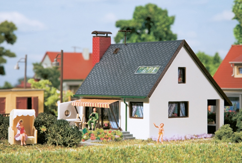 Interessantes Einfamilienhaus. Mit Veranda, schattenspendender Markise und Gartenmöbel sowie Loggia auf der Dachrückseite.