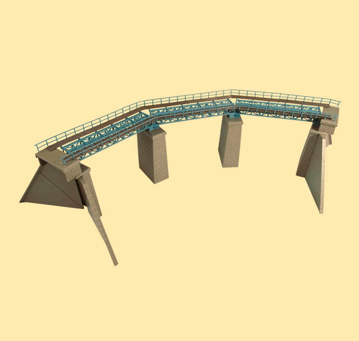 Eingleisig mit 4 Flügelmauern. Der minimalste Radius für diese Brücke ist 396 mm (R 32 und R 31 Tillig-Gleis). Sie ist auch mit gerader Gleisführung verwendbar.