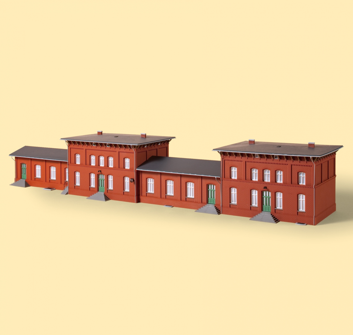 Bahnhöfe der ländlichen Art, wie in Wittenburg, wurden ähnlich auch in Städten gebaut. Natürlich größer! Die damals preiswerte Rasterbauweise haben wir uns zu nutze gemacht und einen Stadtbahnhof entwickelt. Mit Uhr, Lampe und Bänken. Das filigrane Geländer ist aus stabiilem Karton in Lasercut-Technologie gefertigt. Bitte beachten Sie dazu unseren Basteltipp im Katalog oder unter www.auhagen.de.