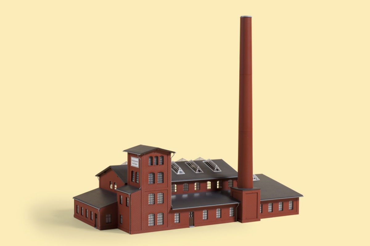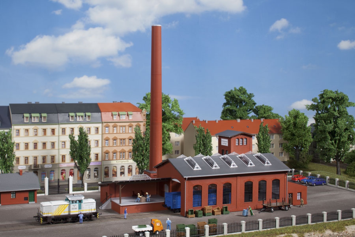 Es wurde ein sehr markantes Vorbild gefunden. Durch Anbauten, Rampe mit Überdachung, Oberlichtfenstern und dem integrierten Schornstein ist das Modell sehr interessant. Das Tor ist zur Einfahrt von Schienenfahrzeugen geeignet. Das Geländer ist aus stabilem Karton in Lasercut-Technologie hergestellt.