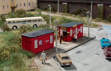 Oft gibt es in Städten einen Busbahnhof als zentrale Umsteigemöglichkeit. Viele entstanden in den 60er und 70er Jahren in Ost- und Westdeutschland mit der raschen Zunahme des Busverkehrs. Das Modell passt durch seine moderne Gestaltung auch in heutige Modellbahn-Epochen.