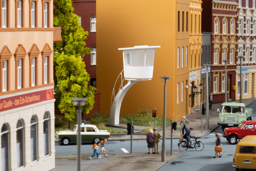 Verkehrskanzel mit Zubehör - Die stark zunehmende Massenmotorisierung in den 1960er Jahren erforderte an neuralgischen Verkehrsknotenpunkten in Großstädten eine sichere Verkehrsu?berwachung und -regelung. Zur Beobachtung und Steuerung des Verkehrs dienten solche Tu?rme. Vom Vorbild unseres Modells konnte bedarfsgerecht manuell in die Steuerung der Lichtsignalanlagen des Straßenbahn-, des Oberleitungsbus- sowie des PKW-Verkehrs eingegriffen werden. Bei einem Ausfall der Technik erfolgte die Verkehrsregelung konventionell durch einen Verkehrspolizisten auf einem Podest in Kreuzungsmitte. Beide Szenarien können mit passenden, beiliegenden unbemalten Figuren nachgestellt werden.Originalmodell