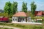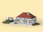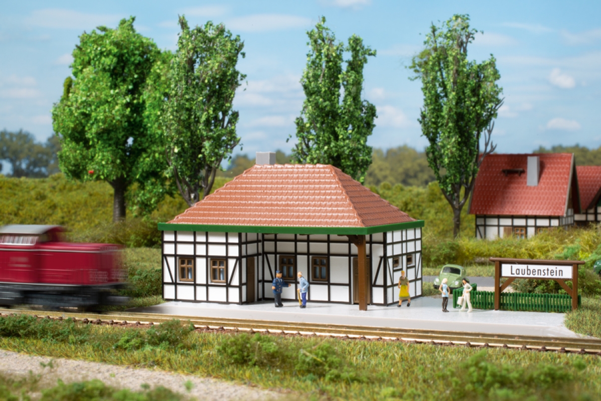 Kleines Gebäude mit Fachwerk, Bahnsteig, Haltepunktschild und Lattenzaun.