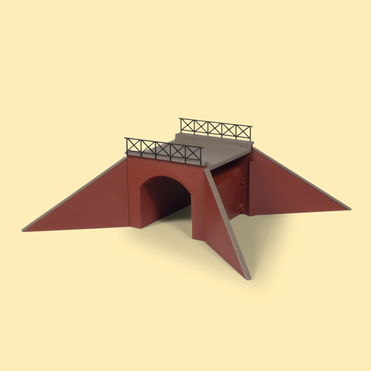 Durch derartige Unterführungen wird der Bahndamm für kleine Straßen, Feldwege oder Bäche geöffnet. Die Ziegelmauer mit Betonabdeckung fügt sich gut in die Landschaft ein. Die Länge der Unterführung ist durch den Einbauwinkel der Flügel variabel. Das Geländer ist aus stabilem Karton in Lasercut-Technologie gefertigt.