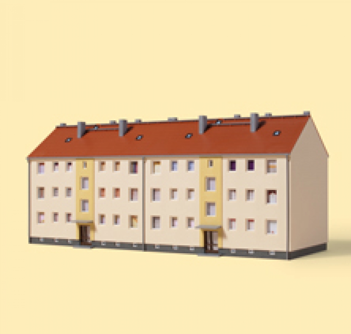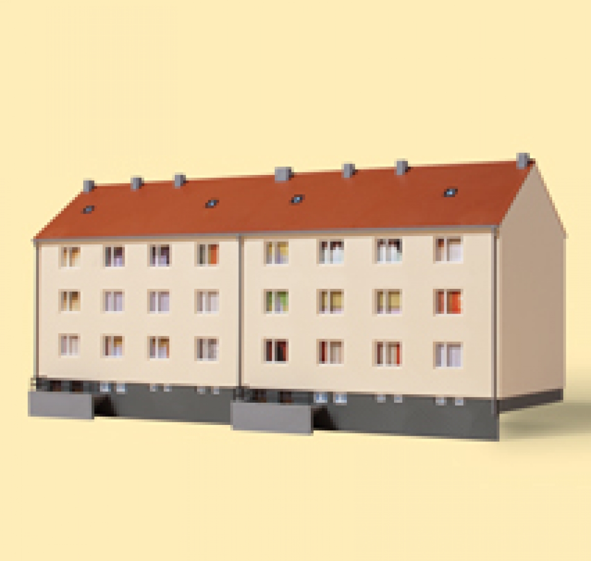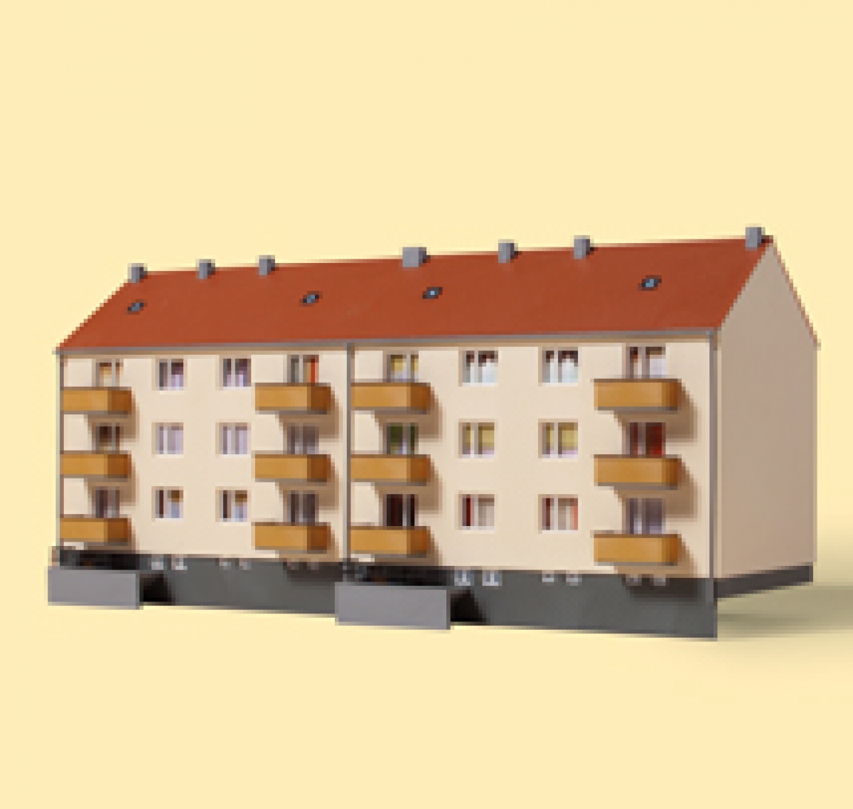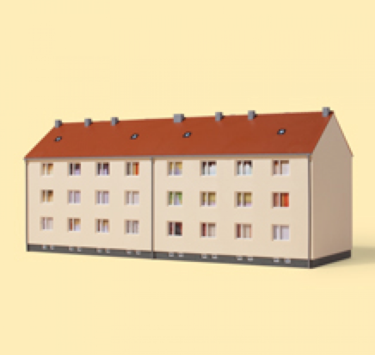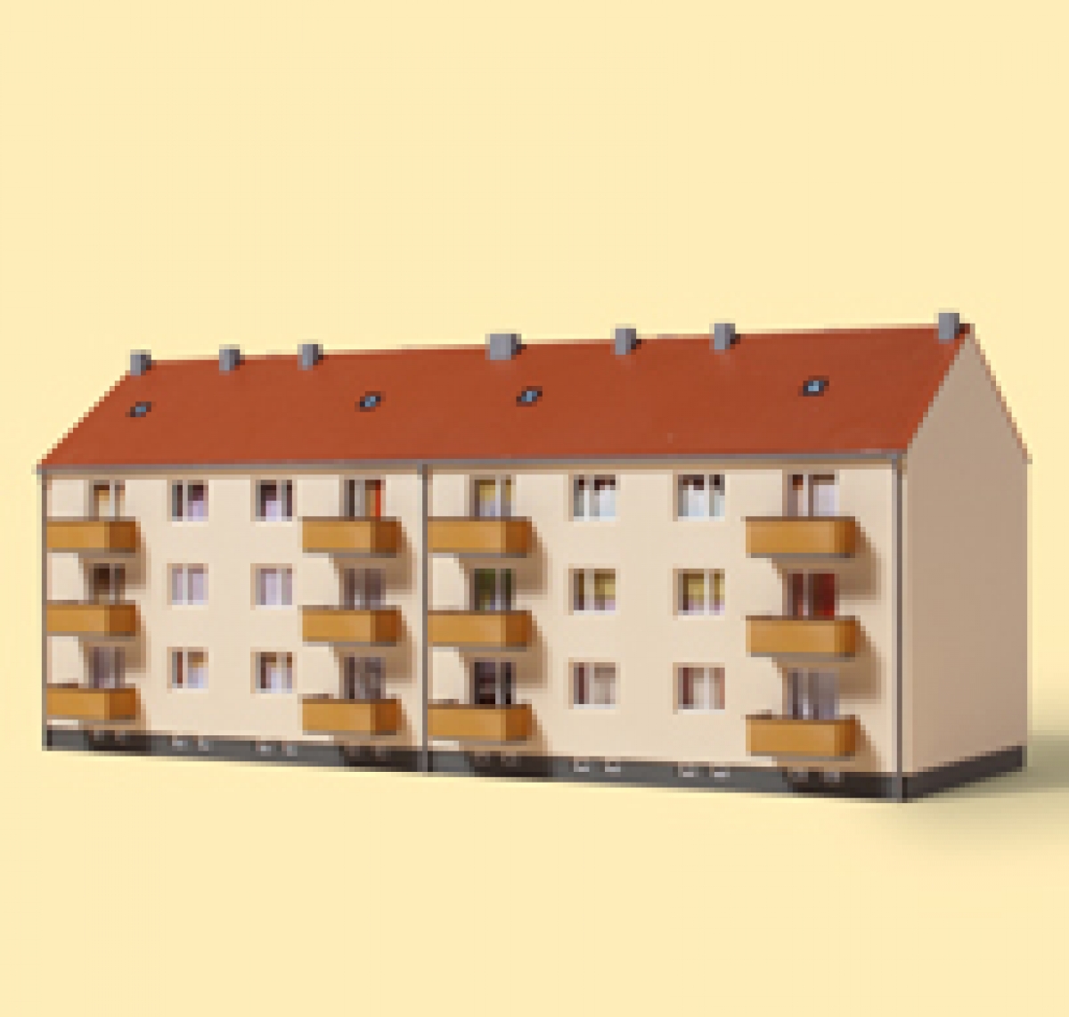Wohnraum war Ende der 1950er Jahre immer noch ein Mangel. Sowohl in der Stadt als auch auf dem Land baute man deshalb diese oder ähnliche Mehrfamilienhäuser. Später wurden sie saniert und modernisiert. Dem Bausatz liegen alle Teile zum Variieren bei. Der Fantasie, eine Neubausiedlung zu gestalten, sind damit keine Grenzen gesetzt.