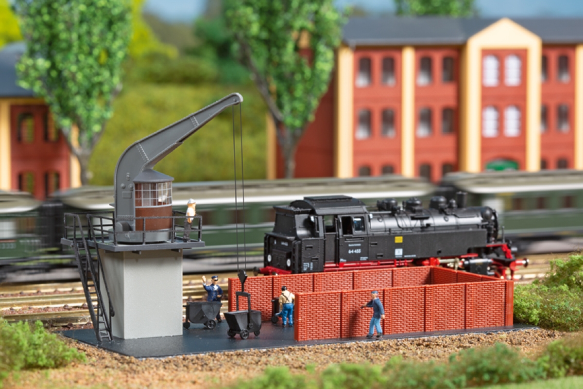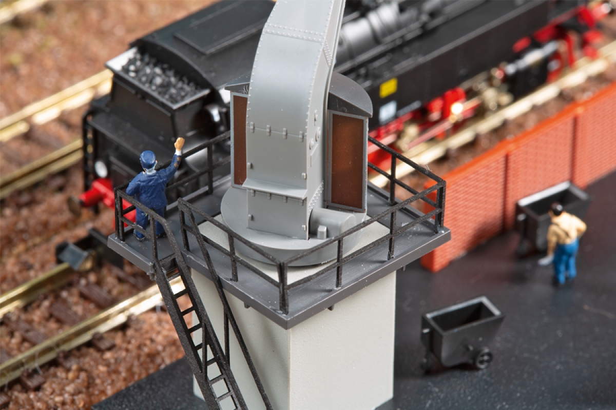 Das Vorbild dieses Bekohlungskranes wurde 1912 gebaut und steht jetzt in Chemnitz/Sachsen. Der Kran ist beweglich und zum Einbau eines Servos vorbereitet. Mit Kohlebansen und 3 Hunten.