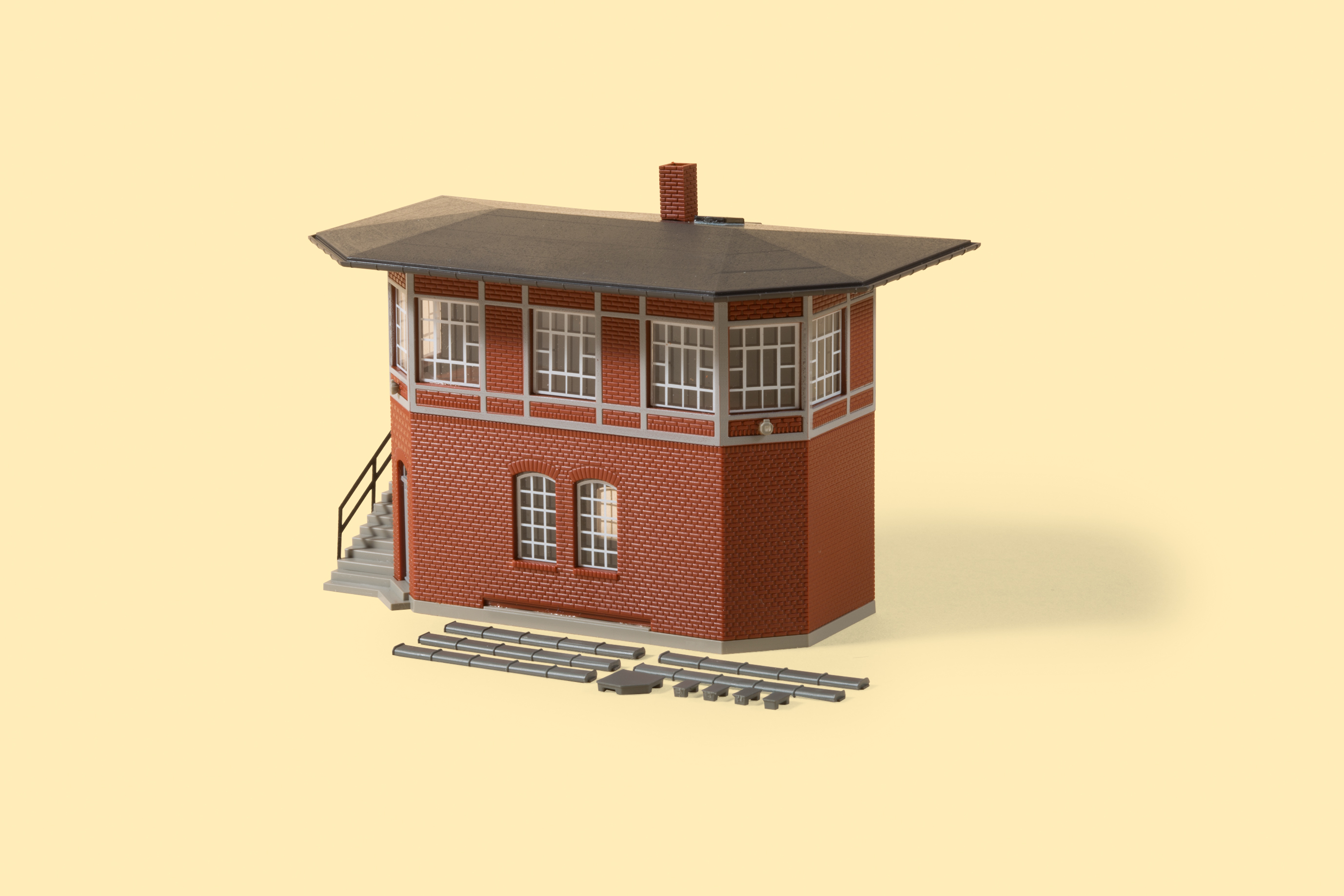 Typenbau. Heute kümmert sich ein Verein um den Erhalt der Bahnanlagen. Durch das graue Fachwerk und die Wandverkleidung auf der Rückseite ist das Stellwerk sehr attraktiv. Abdeckkästen, Umlenkkasten sowie 2 Schein-werferattrappen liegen bei.