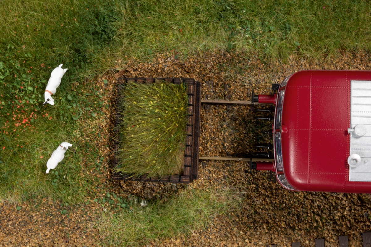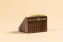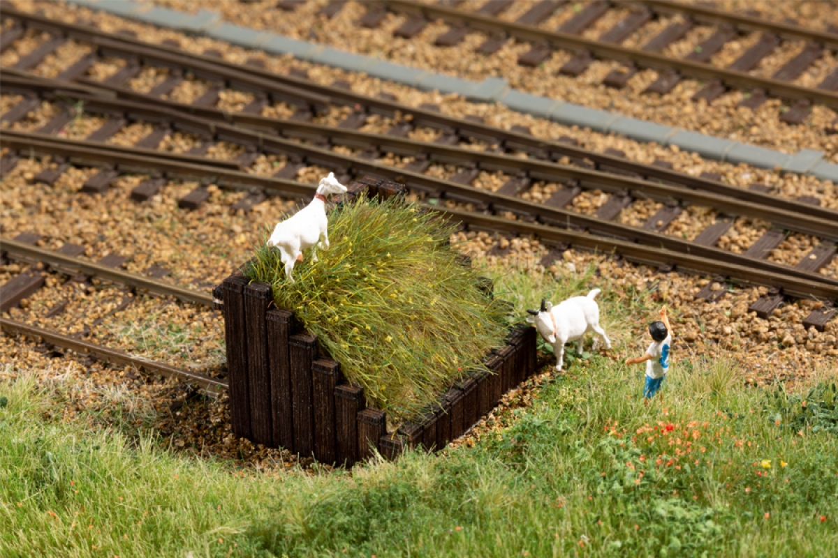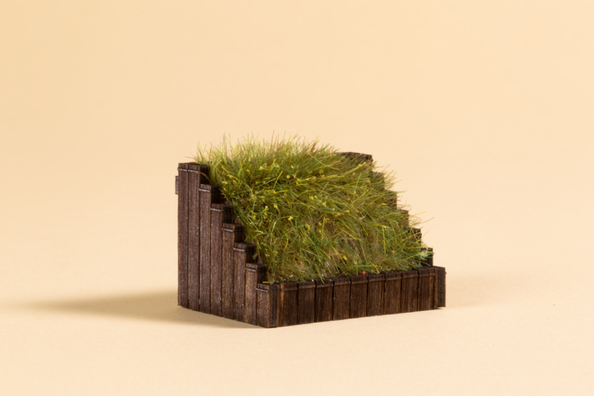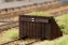 Fertigmodell. Nachbildung eines Prellbocks aus kastenförmig senkrecht eingegrabenen Holzbohlen. Zum Ansetzen an das Gleisende. Die sehr fein strukturierten Holzbohlen des Modells sind aus Echtholz gelasert. Die Füllung des Kastens ist begrünt, und ein Signal Sh0, Gleissperrsignaltafel, ist beigelegt.