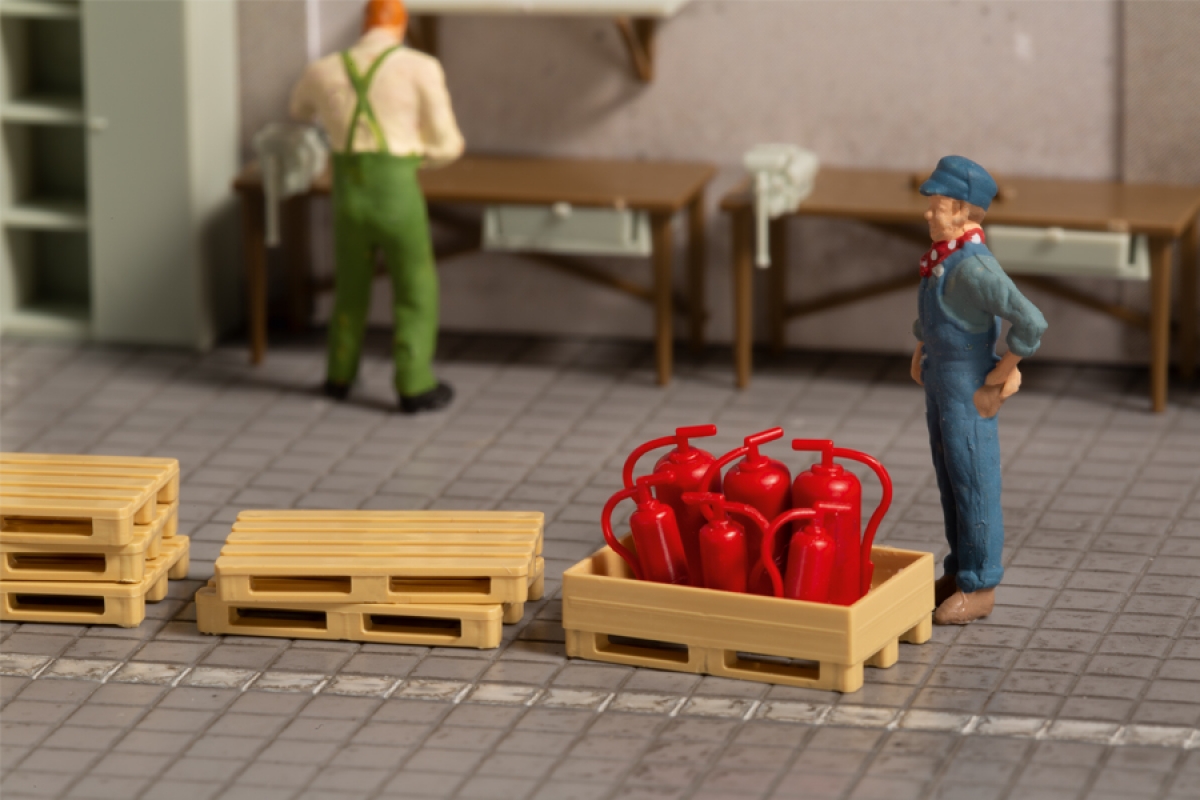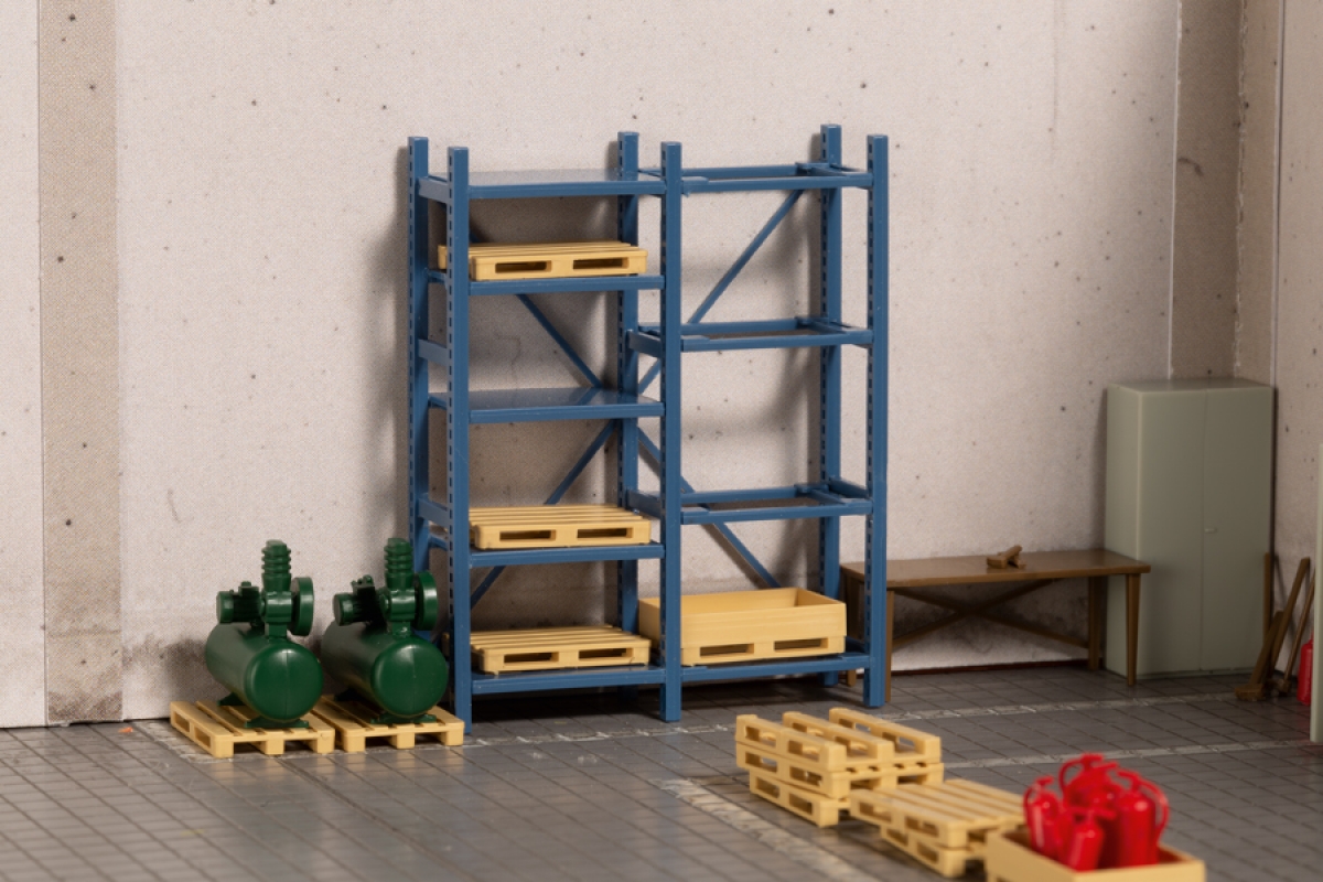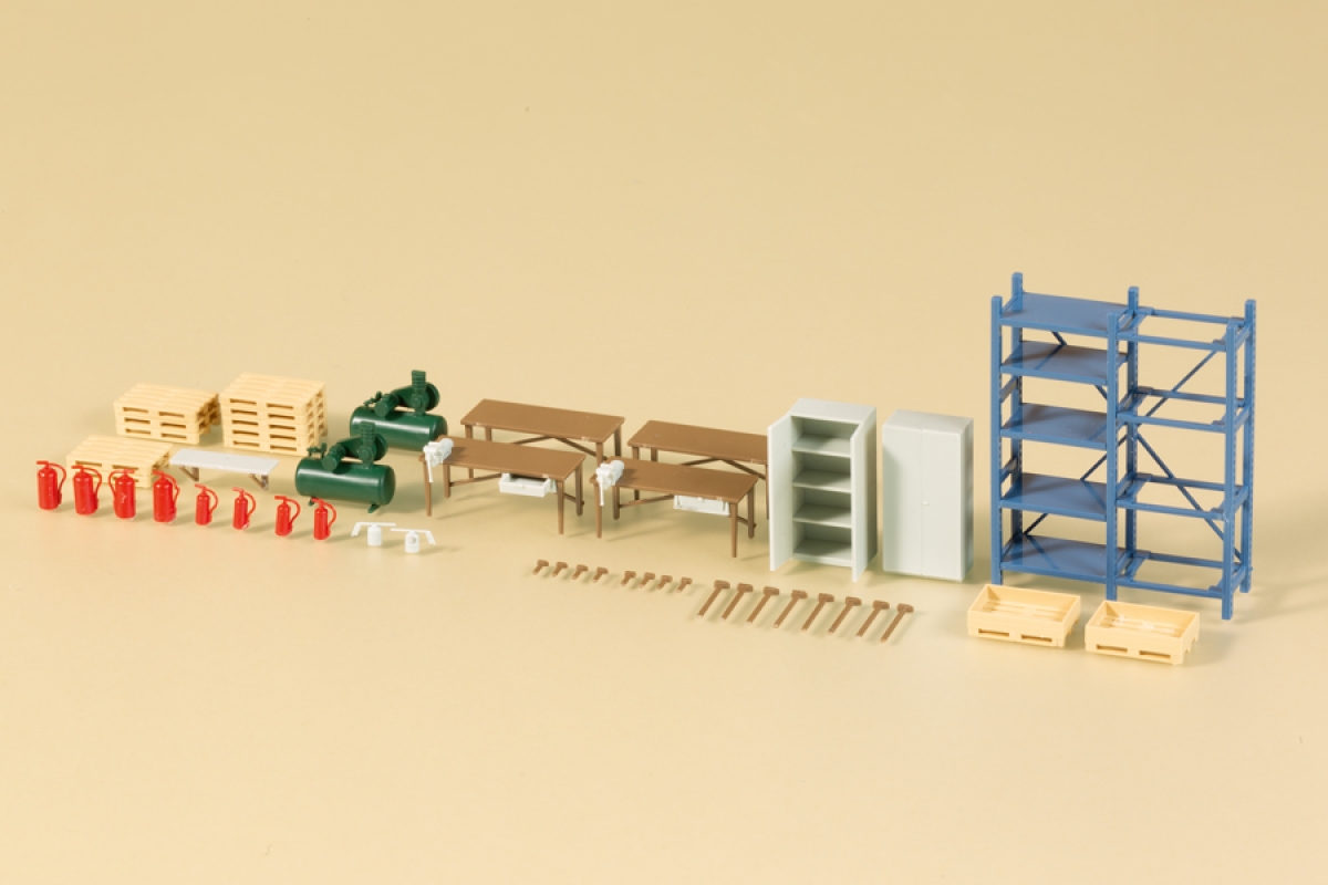 Mit diesem Zubehör-Set können Werkstattbereiche, z.B. in Industriegebäuden, realistisch eingerichtet werden. Werkbänke mit beweglichen Schubkästen und Schraubstöcken sowie Schränke mit geöffnet oder geschlossen montierbaren Türen werden durch zwei Kompressoren mit Zubehör und Feuerlöscher ergänzt. Für das erweiterbare Schwerlastregal liegen Europaletten bei.