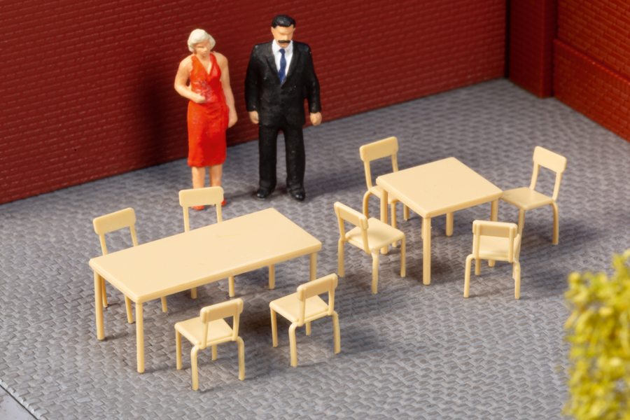 Für Feiern mit vielen Gästen eignet sich das Sortiment von Stühlen und Tischen. An die rechteckigen und quadratischen Tische passen jeweils vier Stühle. Sie können, weil stapelbar, platzsparend gelagert werden. Ideal für die Gestaltung lebendiger Alltagsszenen.