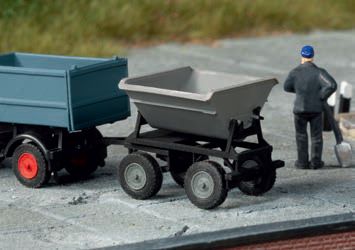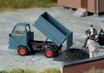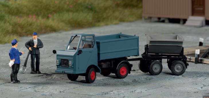 Der Aufbau ist angekippt darstellbar, mit geöffneter Rückwand. Der dazu passende Kipplorenanhänger entspricht einem Vorbild der Firma Fahrzeugbau Lampe aus Möser bei Burg. Die Mulde ist kippbar, die Vorderachse lenkbar.