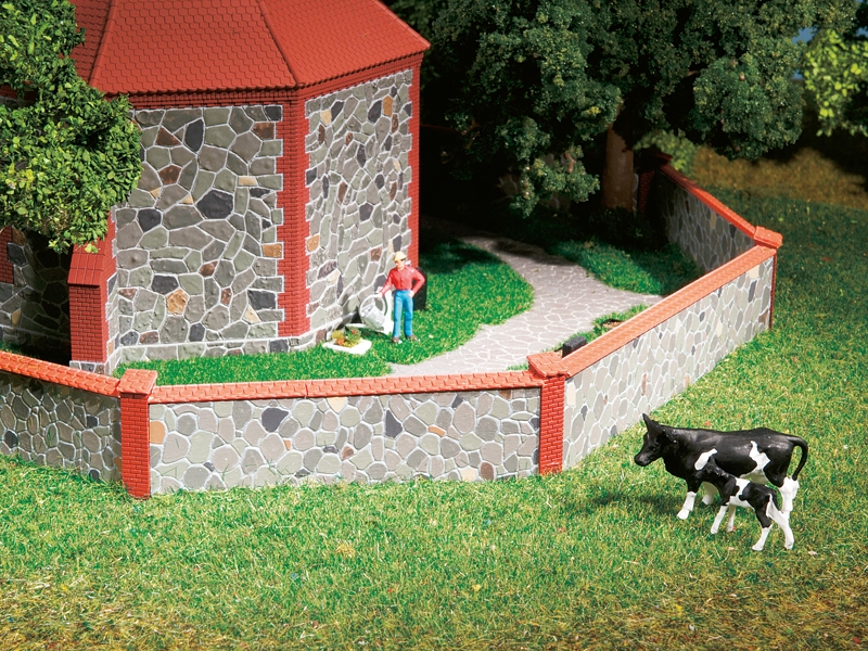 Mit Säulen und Biberschwanzabdeckung. Die Natursteinmauerteile liegen dem Bausatz einfarbig grau bei und wirken realistischer, wenn sie zusätzlich mit matten Farben behandelt werden.