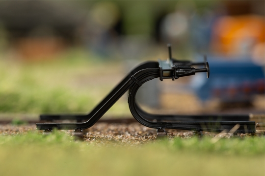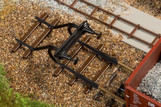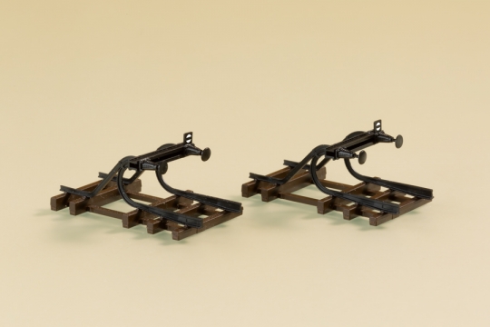 Filigranbausatz. Nachbildung eines Prellbocks aus gebogenen Schienenprofil und Stangenpuffer. Zum Ansetzen an das Gleisende. Die äußerst fein detaillierten Modelle haben angesetzte Puffer und sind je mit einem Signal Sh0, Gleissperrsignaltafel, ausgestattet.