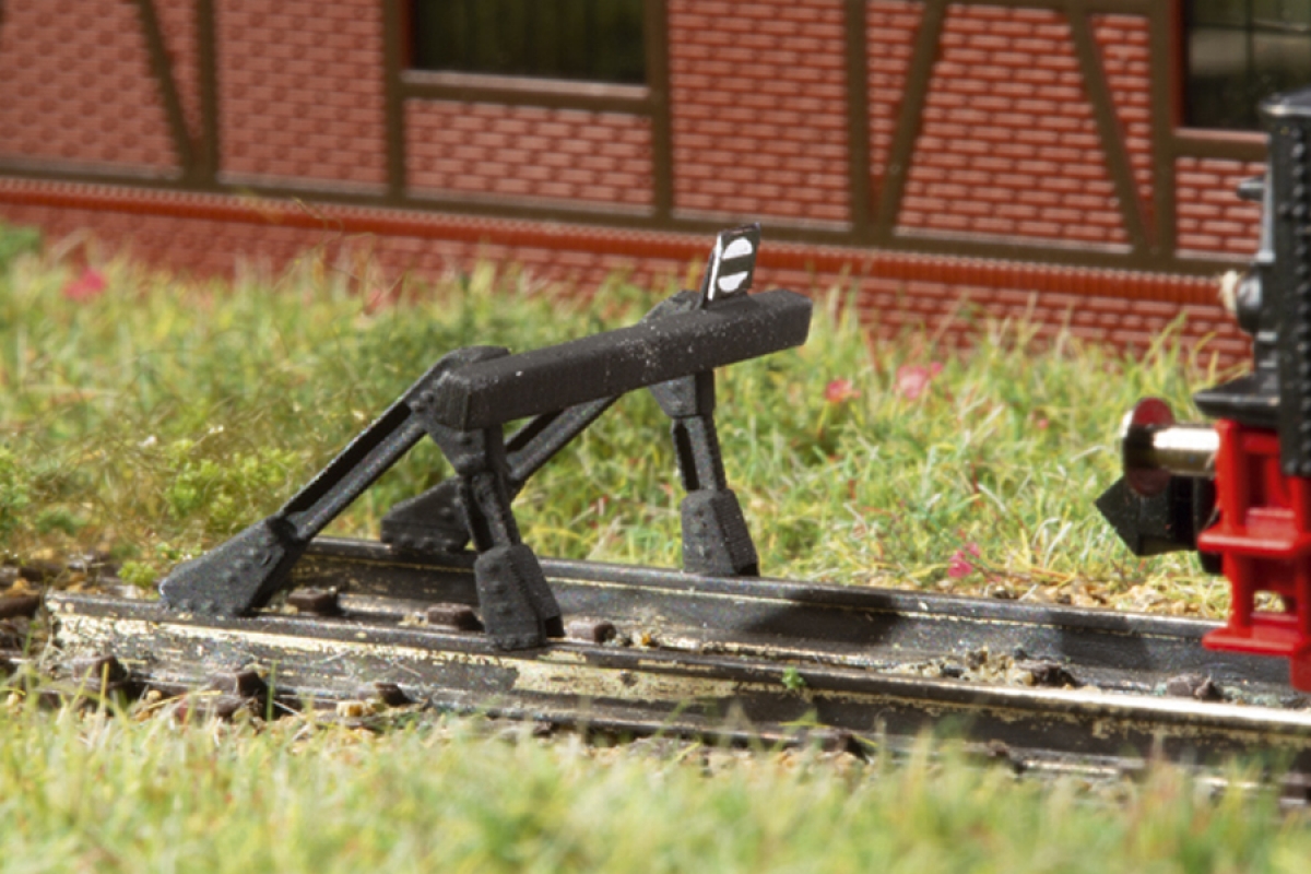 Filigranbausatz. Nachbildung eines Prellbocks aus mit Knotenblechen verschraubten Schienenprofilen. Zum Aufsetzen auf das Gleis. Die beiden fein detaillierten Modelle sind mit je einem Signal Sh0, Gleissperrsignaltafel, ausgestattet.