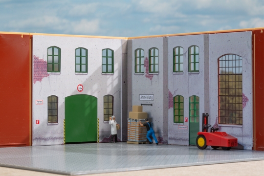Durch große Industriefenster kann man in die Werkhallen hineinsehen. Deshalb sollten sie nicht nur eingerichtet , sondern auch mit Innenwänden aus Karton gestaltet sein. Der Putz weist Alterserscheinungen auf. Zusätzlich liegt eine Dekoration mit Schildern, Warnbaken u. ä. bei. Der Bausatz beinhaltet 96 Innenwände und Säulen sowie Kartonstreifen zum Ausgleich der Höhe zwischen Wand und Fensterrahmen.