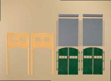 2 Wände mit Toröffnung L sowie Fensteröffnungen M ohne Zahnfries. 2 Holztore L, 2 Rolltore L.