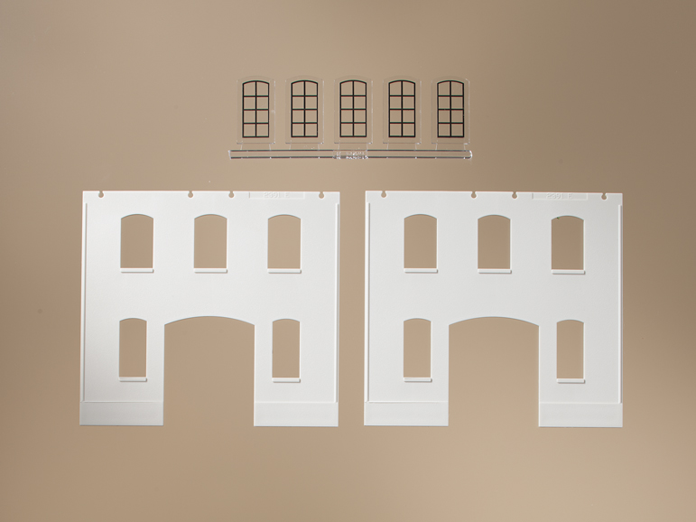 2 Wände mit Toröffnung G sowie Fensteröffnungen B und L. 5 Industriefenster L bedruckt fu?r Erdgeschoss.