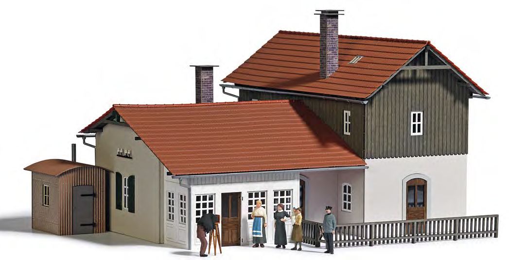 Das Empfangsgebäude hat eine interessante und für Bahngebäude der Region typische Aufteilung durch den quer zum Bahnsteig stehenden höheren Gebäudeteil, in dem sich auch die Dienstwohnung befindet, sowie dem längs zum Bahnsteig angeordneten niedrigeren Gebäudeteil mit dem angebauten Warteraum. Die Struktur der verputzten Wände ist realistisch dargestellt. Der Dachgiebel besteht aus echtem Holz. Das Ziegeldach mit dem großen Dachüberhang hat eine vorbildgerechte Struktur in Optik und Haptik. Regenrinnen, Fallrohre und Isolatoren für die Stromversorgung sind filigran ausgeführt. An der Rückseite befindet sich ein kleiner Holzschuppen als Anbau. Weitere Echt-Holz-Teile sind die Türen, Sprossenfenster und Klappläden. Die Eingangstür zum Warteraum lässt sich öffnen (Öffnung 20 x 47 mm). Holzzaun als Bahnsteigsperre. Mit verrostetem Wellblechschuppen mit Sprossenfenstern an den Längsseiten und Stahltür zum Öffnen an einer Stirnseite (Öffnung 19 x 42 mm). Dach mit Rauchrohr. Die enthaltenen Figuren stellen original Personen aus dem historischen Bahnhofsumfeld dar: einen Fotografen mit Plattenkamera auf einem Holzstativ, zwei Frauen, eine Mutter mit Kind und einen Bahnbeamten. Die Figuren sind detailliert ausgeführt. 35 - 41 mm. Dem Bahnhof-Set Rothenstadt beigelegt ist ein Nachdruck der Originalfotografie, die als Vorlage des Bahnhofs sowie des Figurensets diente. Größe: 148 x 210 mm. Alle Holzelemente und Figuren sind bereits fertig koloriert. Beleuchtbar mit Busch LEDs 5998. Bausatz. Größe Bahnhofsgebäude: 345 x 312 mm, 205 mm. Größe Wellblechschuppen: 68 x 58 mm, 78 mm.