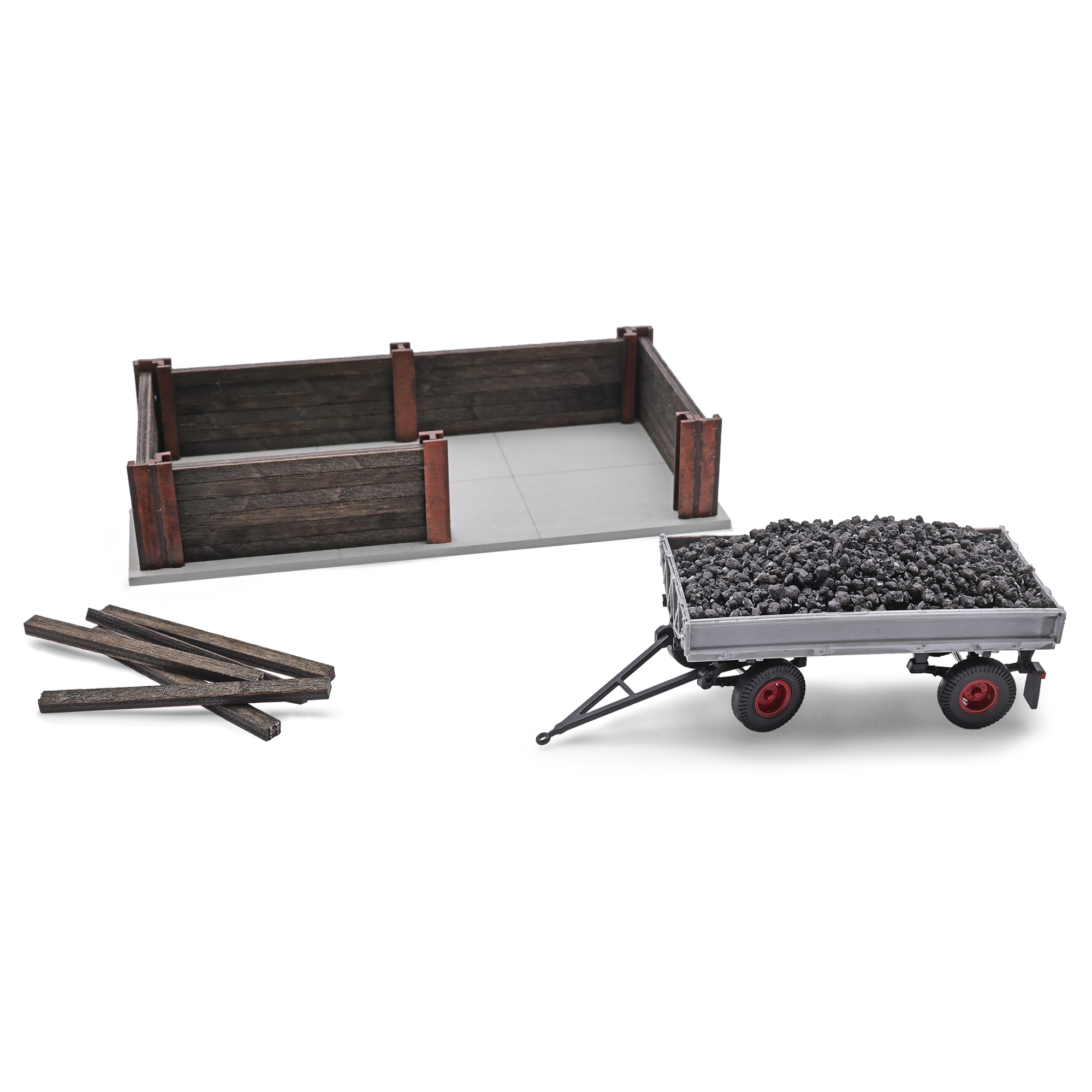 Komplett-Set einer Bekohlungsanlage mit Bagger für Bahnhöfe, Bahnbetriebswerke, einem Binnenhafen oder einer Kohlenhandlung. Mit Betonsockel, Umzäunung aus T-Trägern und echten Holzbohlen, »Kohle« als Befüllung, 2 Echtholz-Pilzleuchten (unbeleuchtet) und Weimar Mobilbagger mit Baggerschaufel. Bausatz (Bagger Fertigmodell, Farbe kann von der Abbildung abweichen).