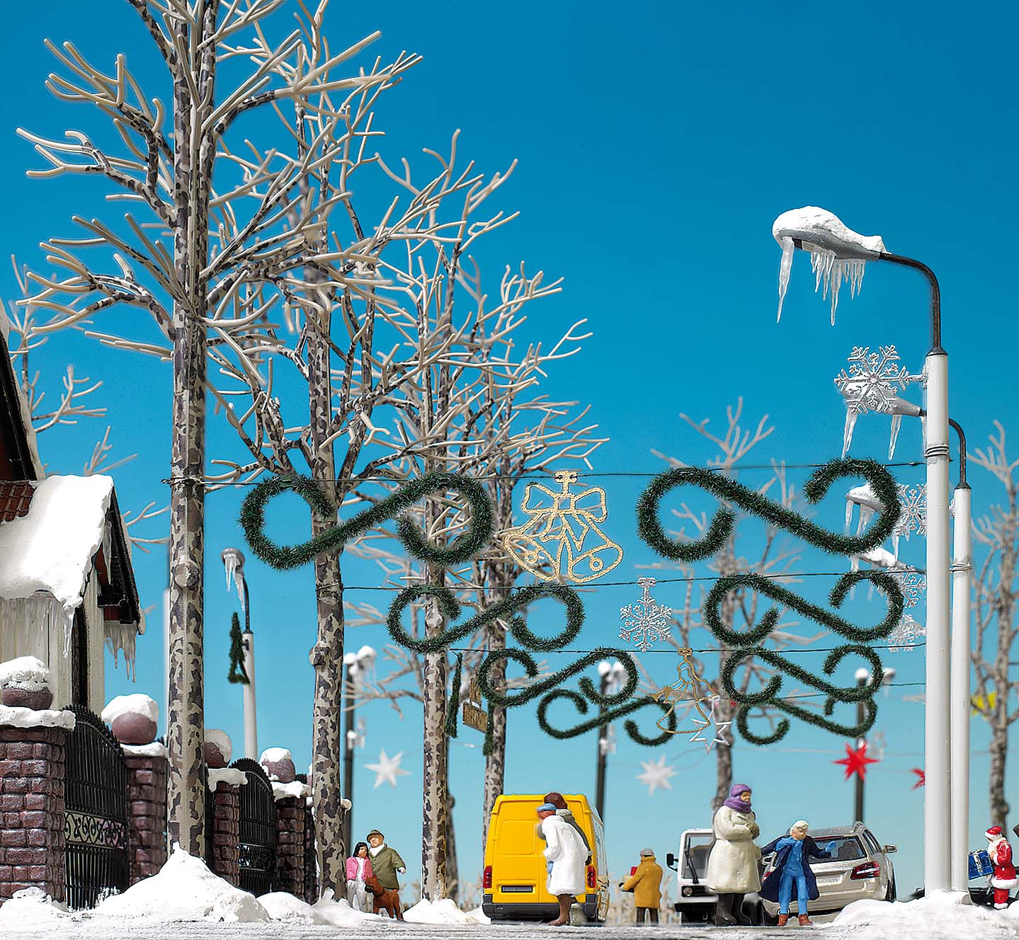 Bausatz für 8 Tannengirlanden, 4 silberne Schneeflocken und 2 Sterne, 2 Goldengel, 4 goldene Glocken, 2 goldene Schriften (Frohe Weihnachten) und 2 grüne Tannen. Alle Teile sind farbig koloriert. Die Ornamente können z.B. auch für die Dekoration von Weihnachtskarten u.Ä. verwendet werden.